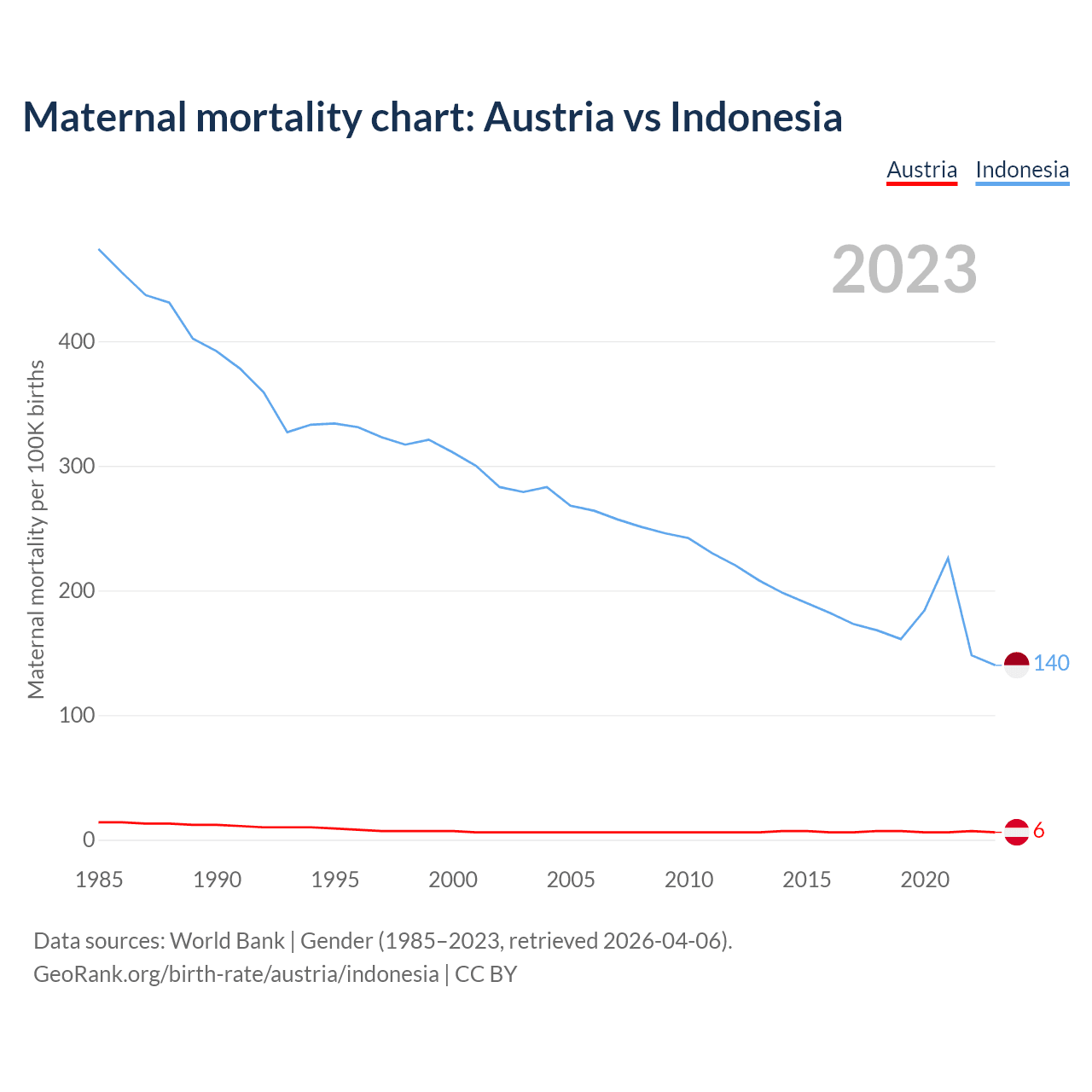 The maternal mortality rate, which is the probability of dying during childbirth or within 42 days of pregnancy termination, is 6 deaths per 100,000 live births in Austria, compared to 140 deaths in Indonesia.