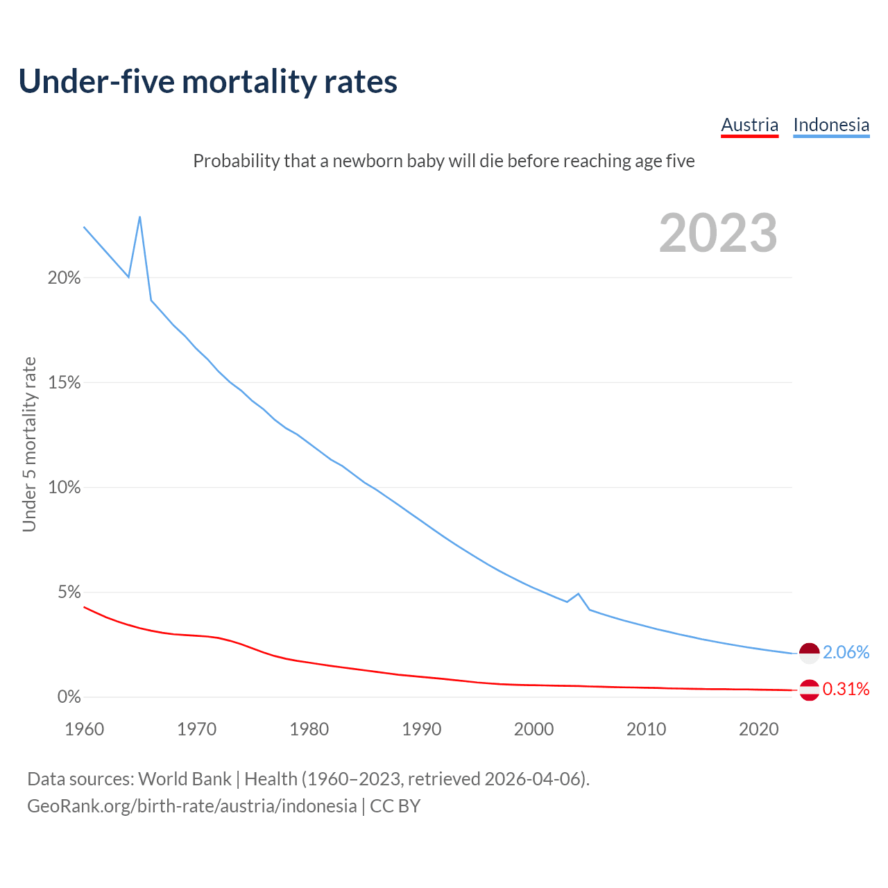 The chance that a newborn baby will die before reaching age five is 0.31% in Austria and 2.06% in Indonesia. Above is a chart with historical data on under-five mortality rates.