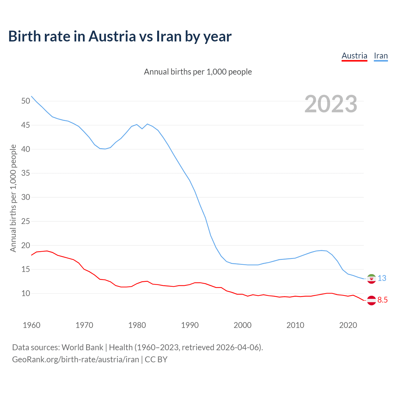 According to the latest available data on birth rates, the fertility rate in Austria was 1.32 children per woman in 2023, compared to 1.7 in Iran in 2023. The replacement level is considered to be 2.1 children per woman.