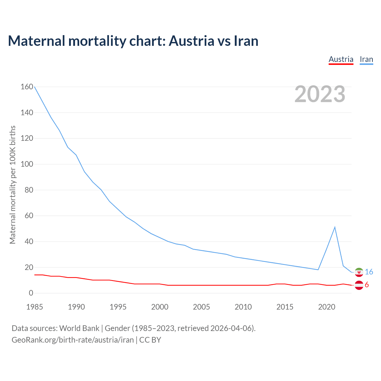 The maternal mortality rate, which is the probability of dying during childbirth or within 42 days of pregnancy termination, is 6 deaths per 100,000 live births in Austria, compared to 16 deaths in Iran.