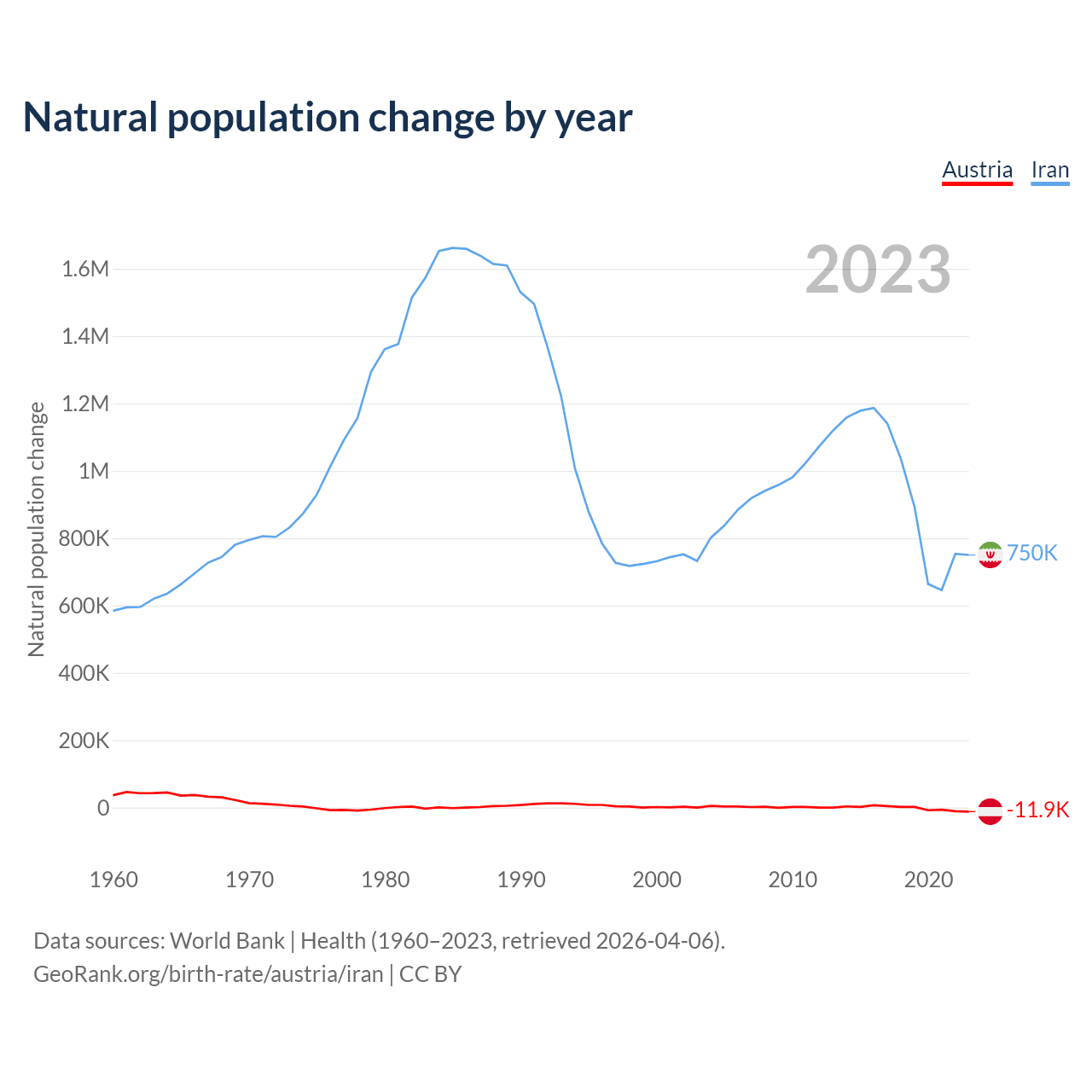 Austria has an annual birth rate of 8.5 births per 1,000 people, compared to 13 for Iran. The average number of children a woman is expected to have during her lifetime — the fertility rate, is 1.32 in Austria and 1.7 in Iran — 28.4% difference.