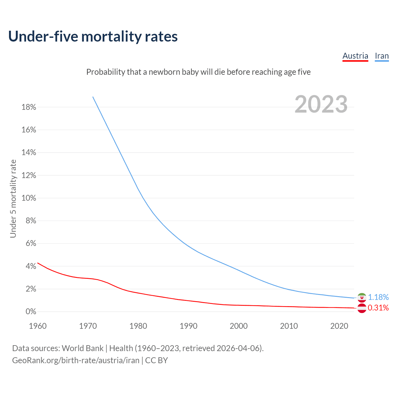 The chance that a newborn baby will die before reaching age five is 0.31% in Austria and 1.18% in Iran. Above is a chart with historical data on under-five mortality rates.