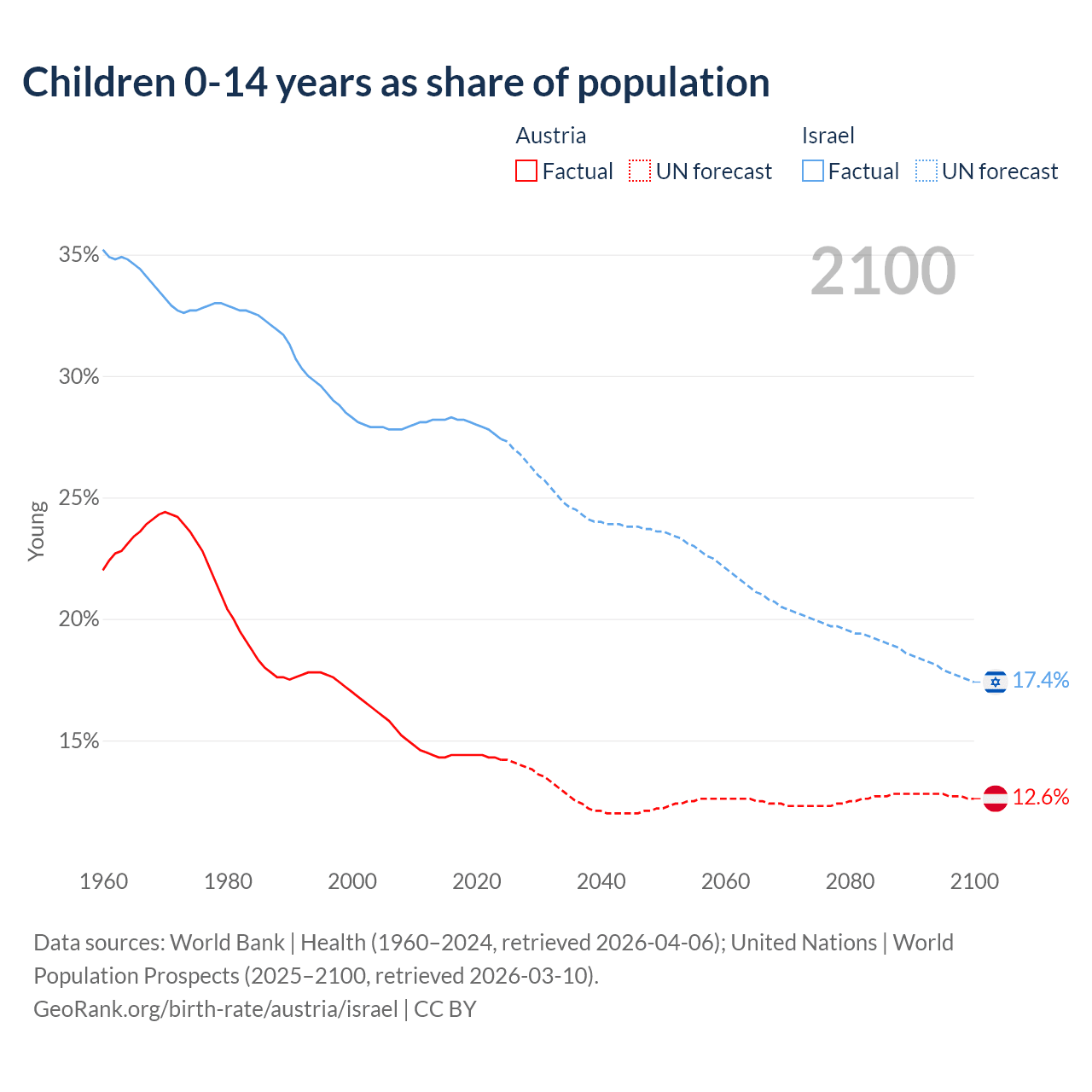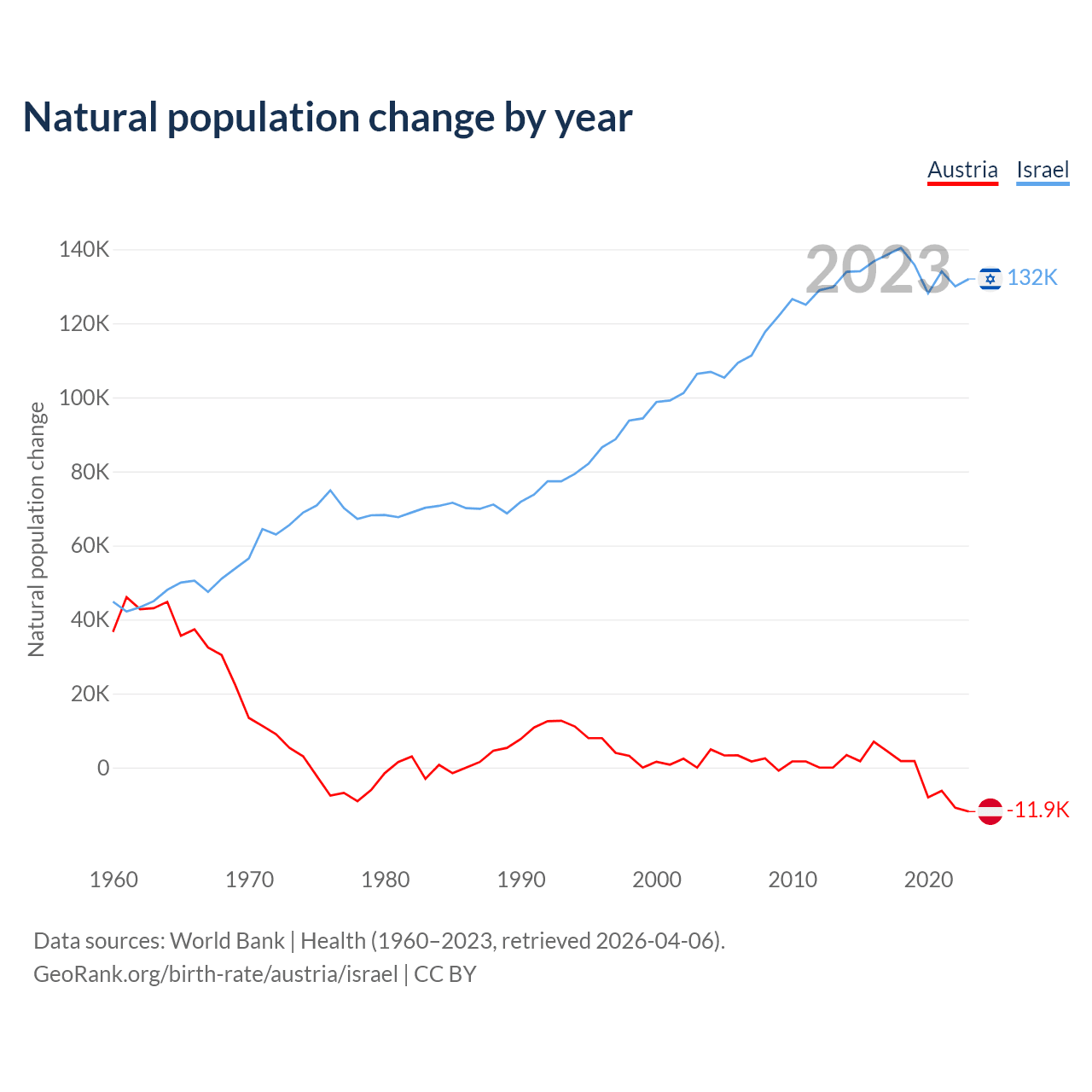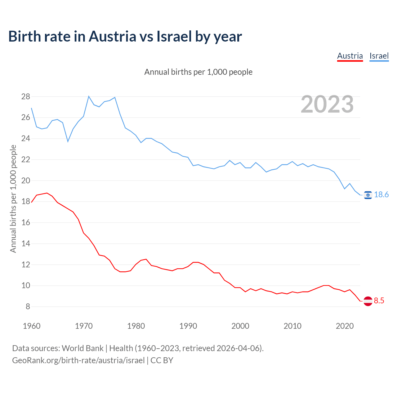 According to the latest available data on birth rates, the fertility rate in Austria was 1.32 children per woman in 2023, compared to 2.85 in Israel in 2023. The replacement level is considered to be 2.1 children per woman.