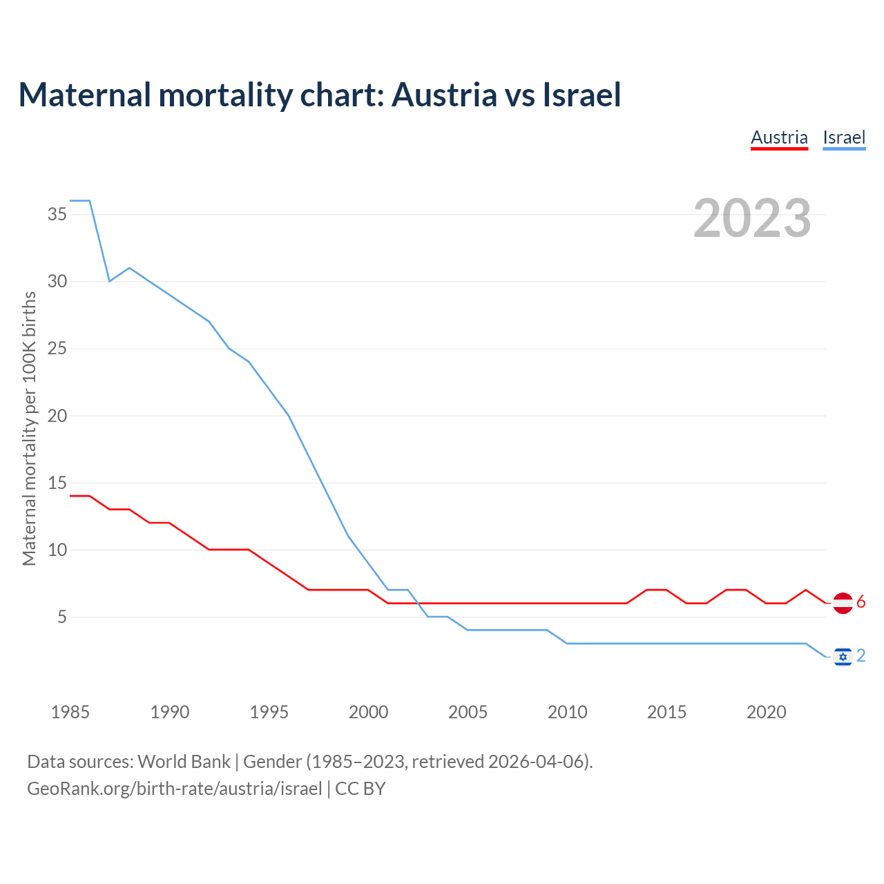 The maternal mortality rate, which is the probability of dying during childbirth or within 42 days of pregnancy termination, is 6 deaths per 100,000 live births in Austria, compared to 2 deaths in Israel.