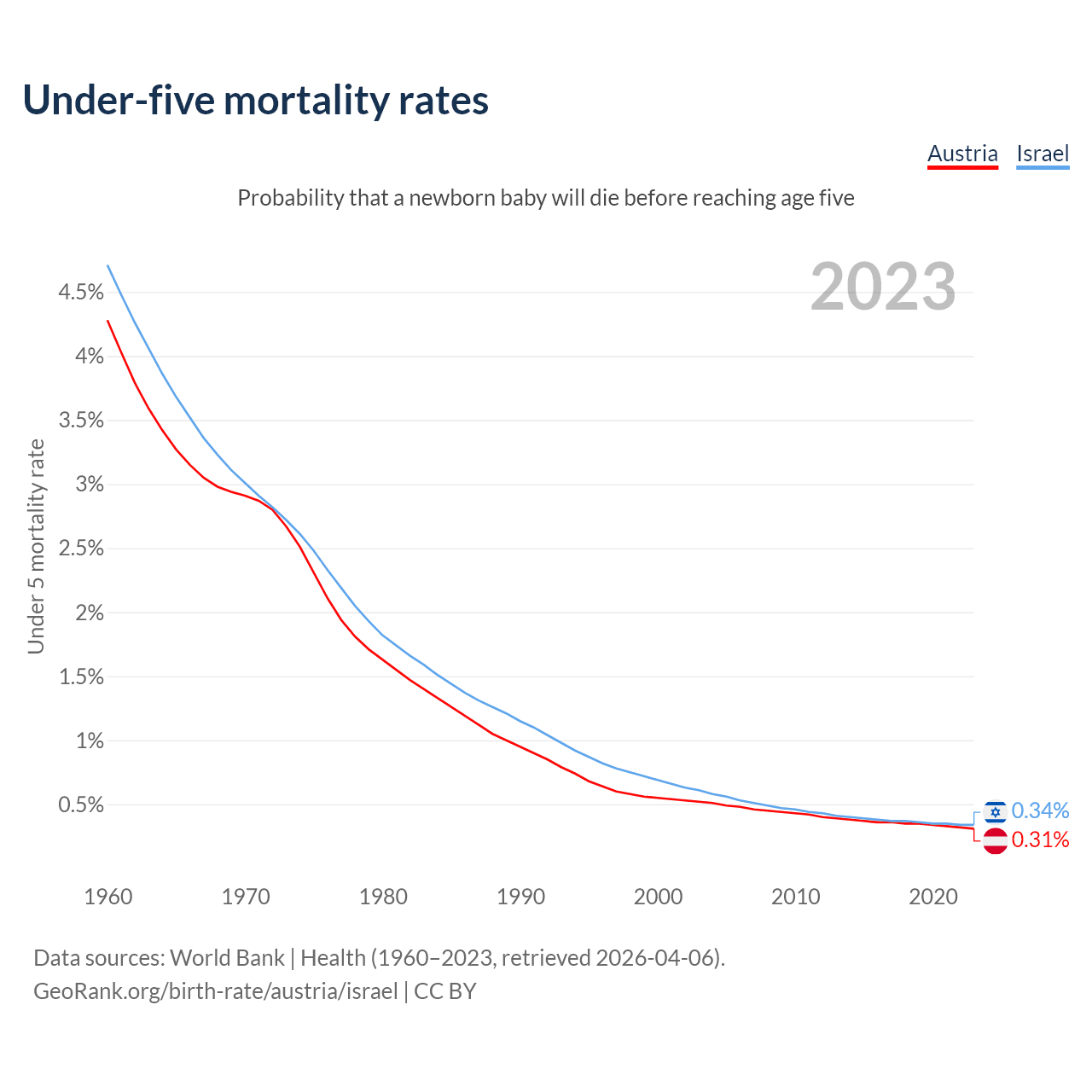 The chance that a newborn baby will die before reaching age five is 0.31% in Austria and 0.34% in Israel. Above is a chart with historical data on under-five mortality rates.