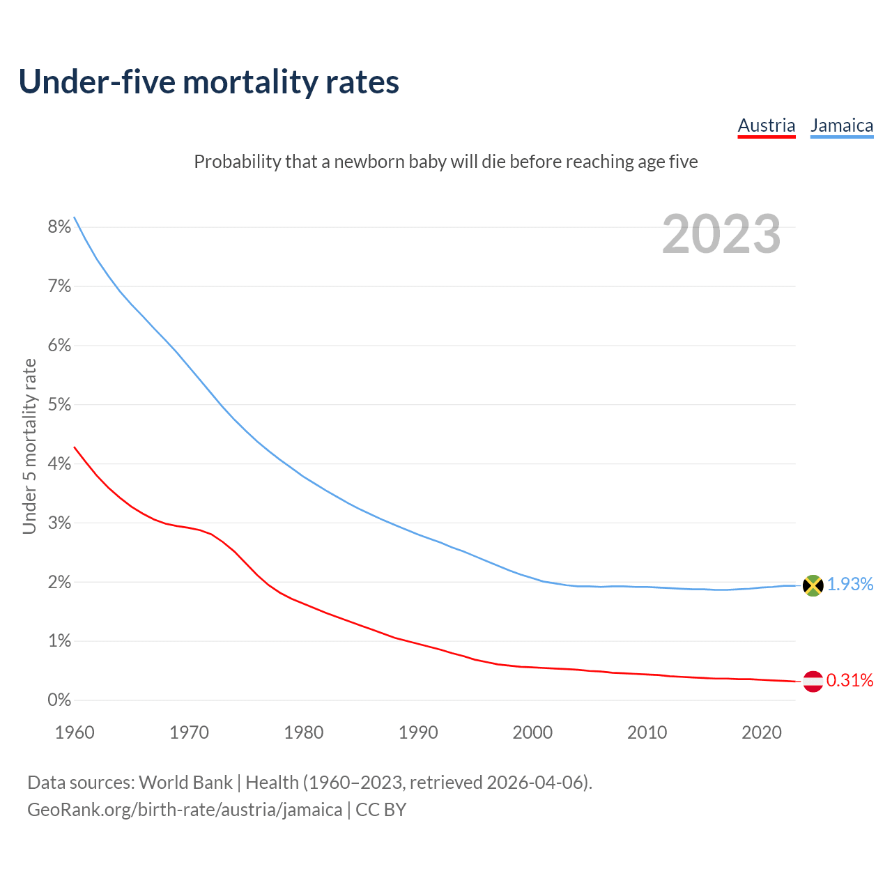 The chance that a newborn baby will die before reaching age five is 0.31% in Austria and 1.93% in Jamaica. Above is a chart with historical data on under-five mortality rates.
