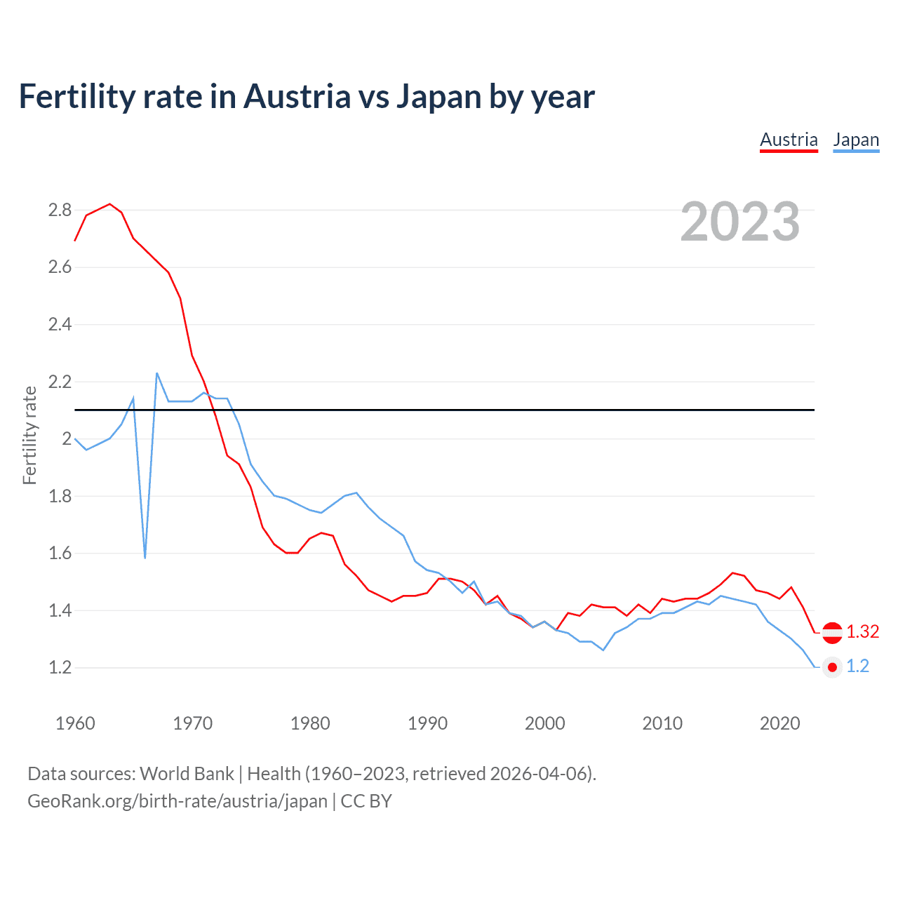 1960 vs 2023, the fertility rate has decreased by 50.9% in Austria and by 40% in Japan — in 1960, it was 2.69 and 2, respectively.