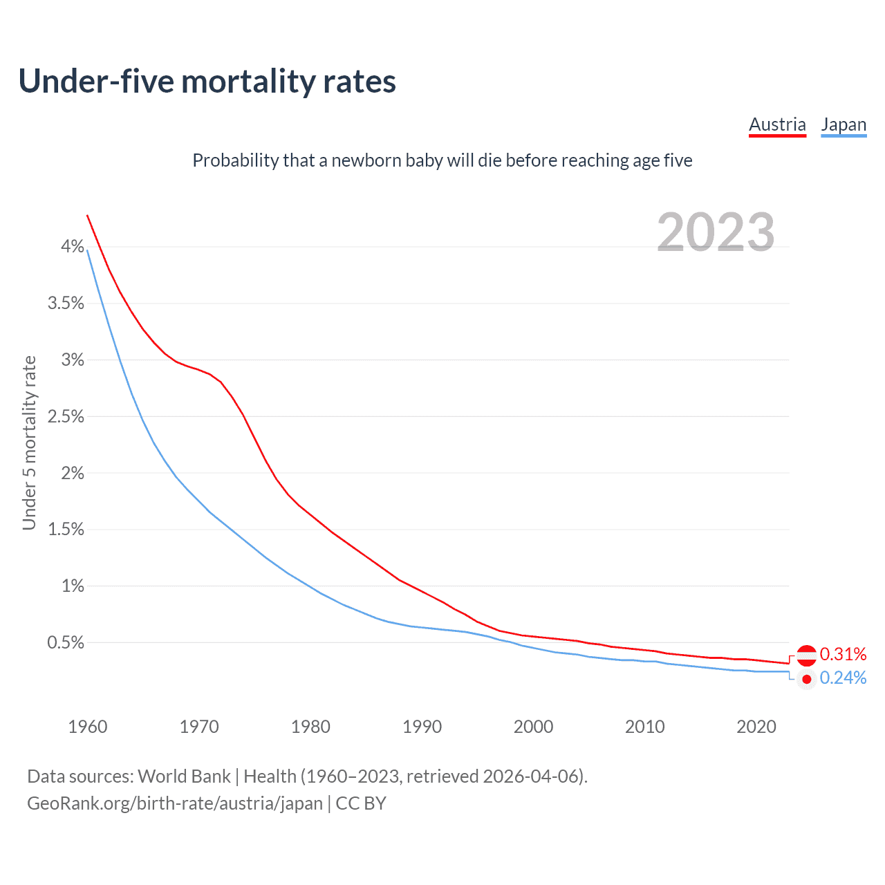 The chance that a newborn baby will die before reaching age five is 0.31% in Austria and 0.24% in Japan. Above is a chart with historical data on under-five mortality rates.
