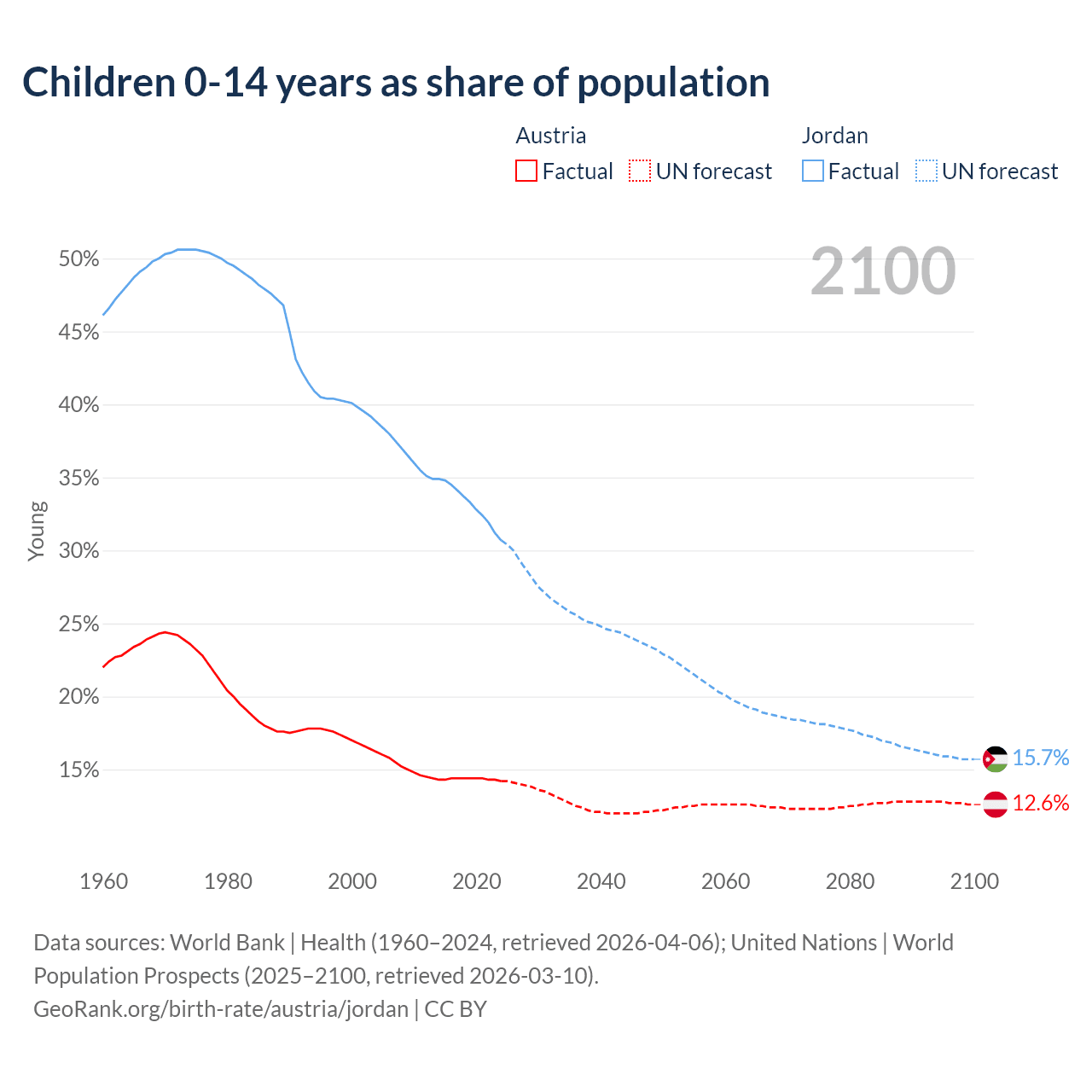 According to the latest available data on birth rates, the fertility rate in Austria was 1.32 children per woman in 2023, compared to 2.64 in Jordan in 2023. The replacement level is considered to be 2.1 children per woman.