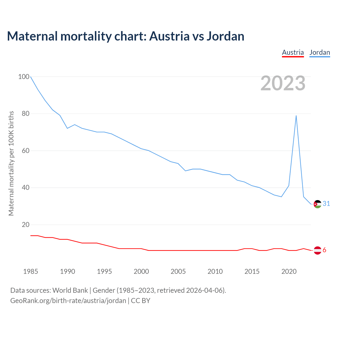 The maternal mortality rate, which is the probability of dying during childbirth or within 42 days of pregnancy termination, is 6 deaths per 100,000 live births in Austria, compared to 31 deaths in Jordan.