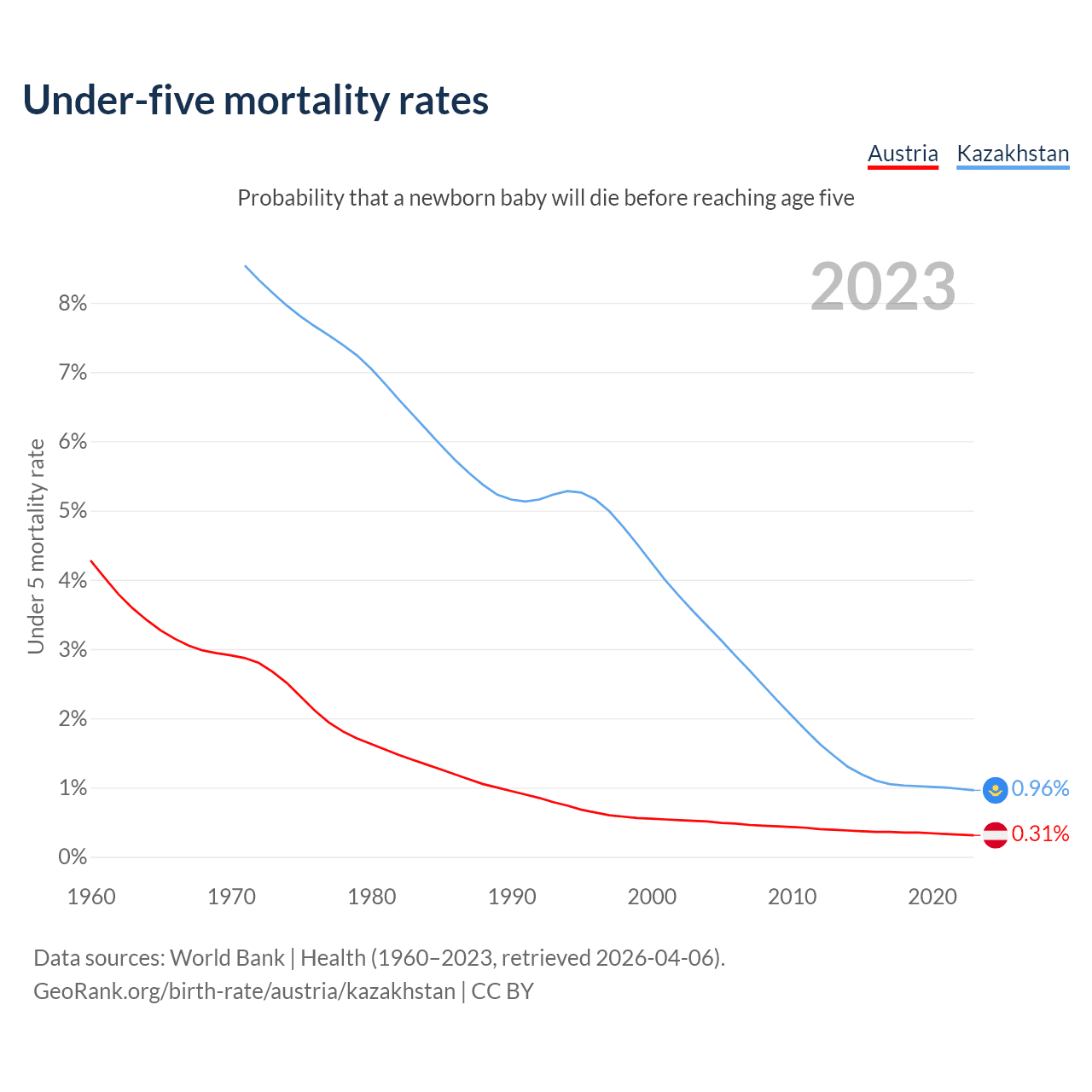 The chance that a newborn baby will die before reaching age five is 0.31% in Austria and 0.96% in Kazakhstan. Above is a chart with historical data on under-five mortality rates.