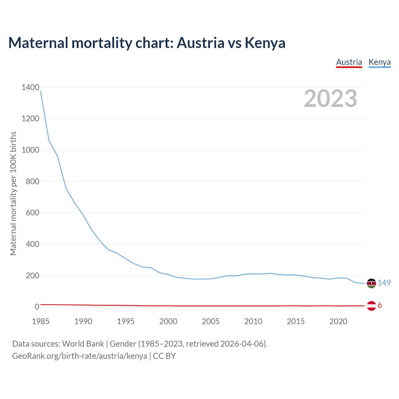 The maternal mortality rate, which is the probability of dying during childbirth or within 42 days of pregnancy termination, is 6 deaths per 100,000 live births in Austria, compared to 149 deaths in Kenya.