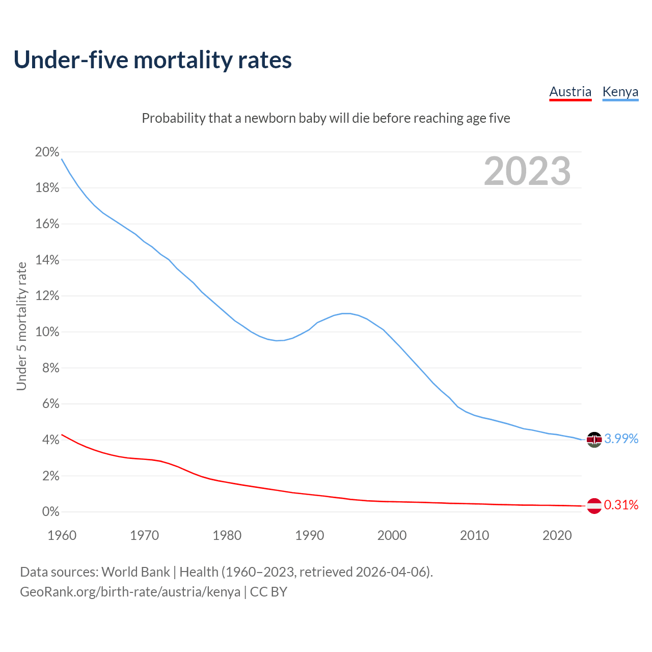 The chance that a newborn baby will die before reaching age five is 0.31% in Austria and 3.99% in Kenya. Above is a chart with historical data on under-five mortality rates.