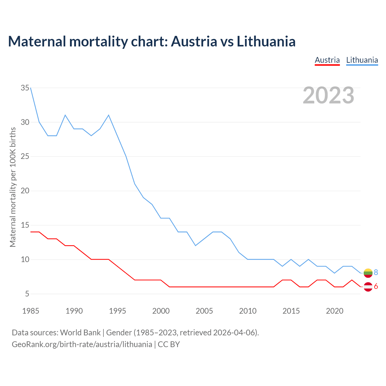 The maternal mortality rate, which is the probability of dying during childbirth or within 42 days of pregnancy termination, is 6 deaths per 100,000 live births in Austria, compared to 8 deaths in Lithuania.