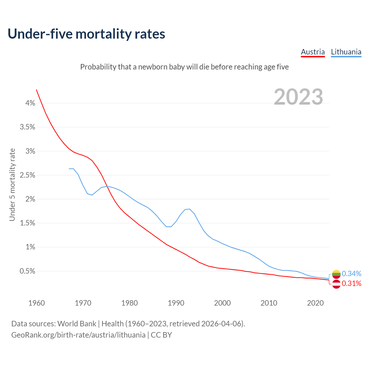 The chance that a newborn baby will die before reaching age five is 0.31% in Austria and 0.34% in Lithuania. Above is a chart with historical data on under-five mortality rates.