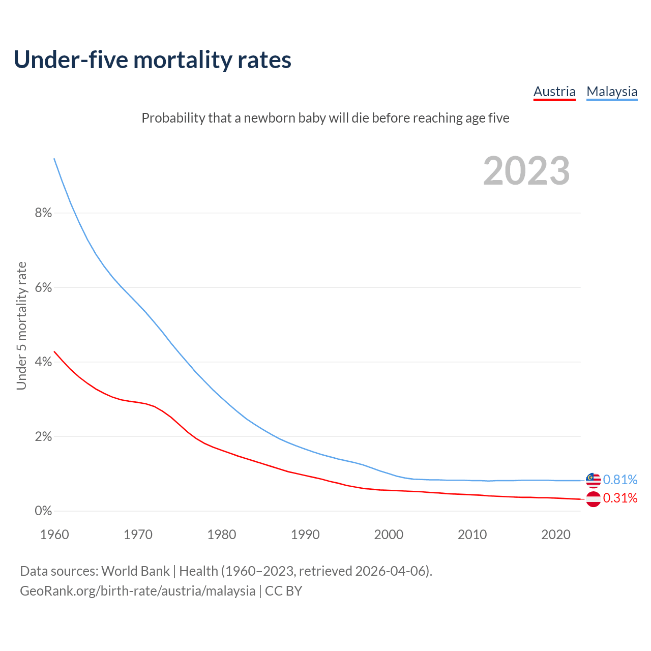 The chance that a newborn baby will die before reaching age five is 0.31% in Austria and 0.81% in Malaysia. Above is a chart with historical data on under-five mortality rates.