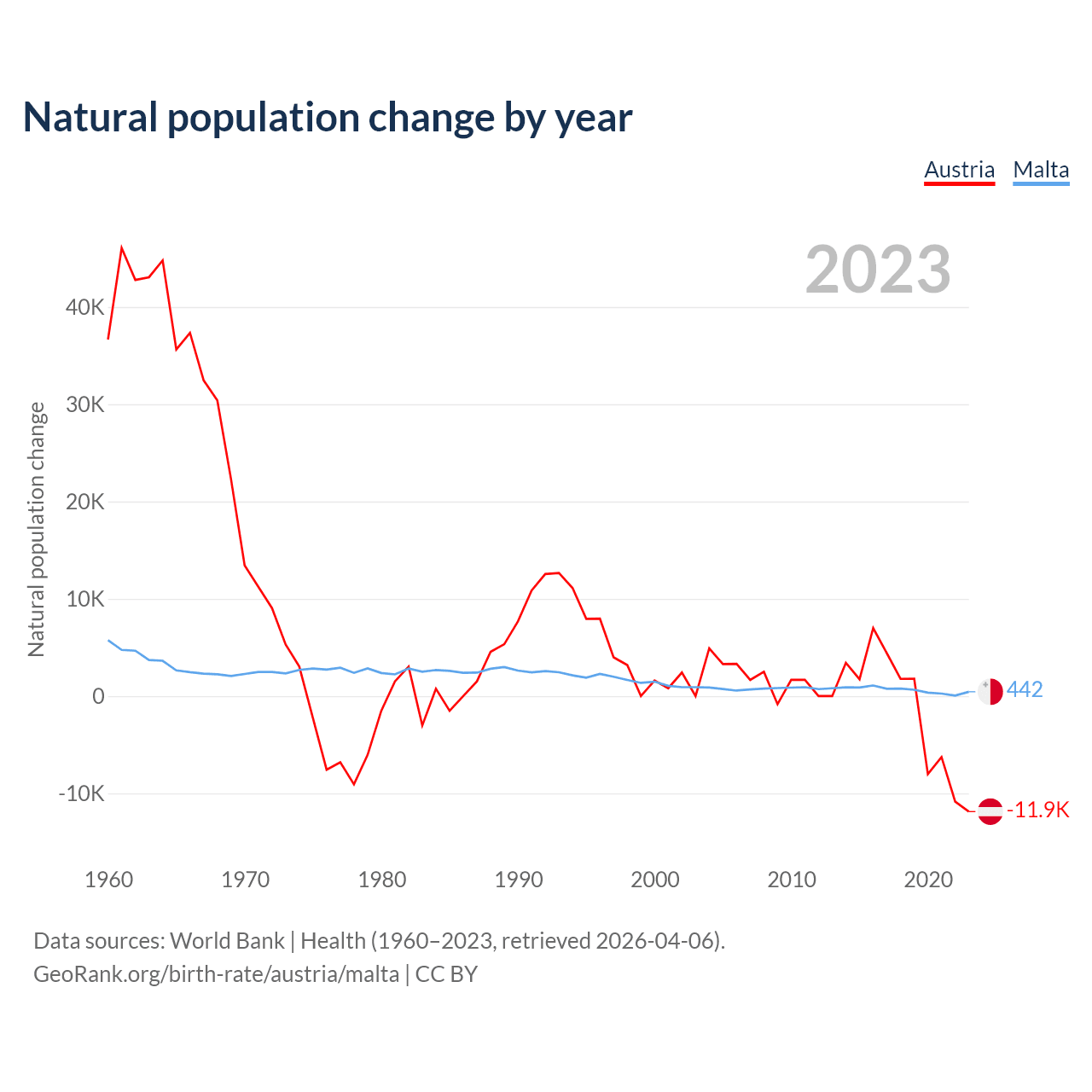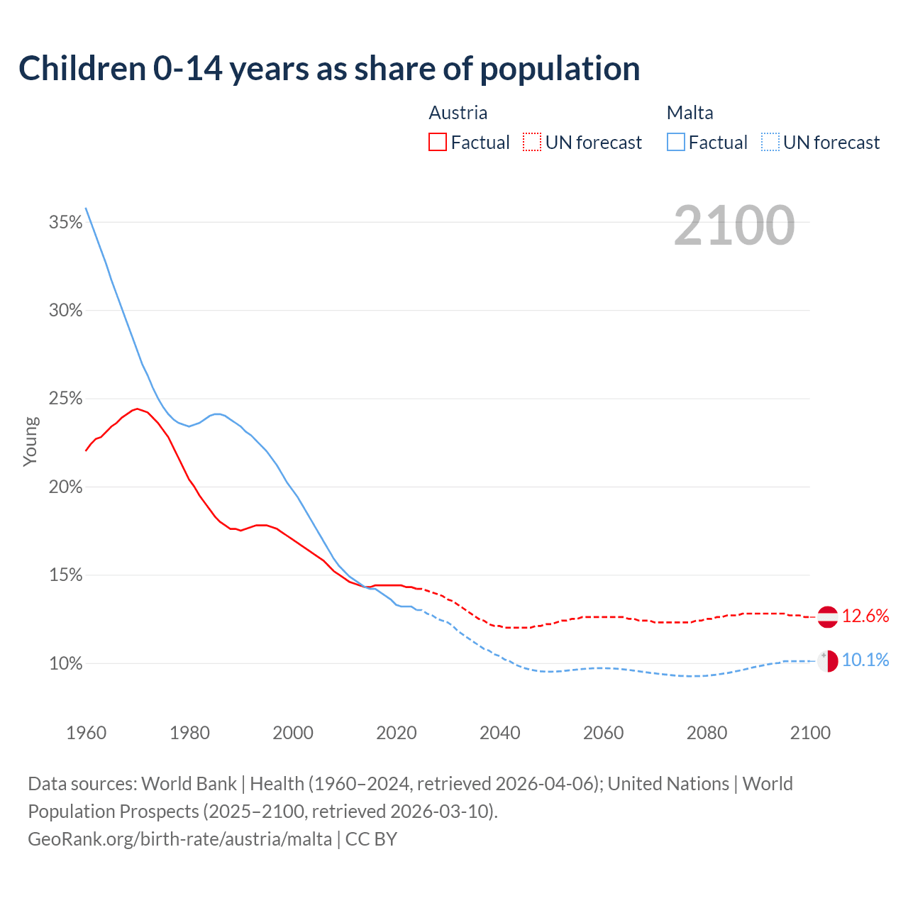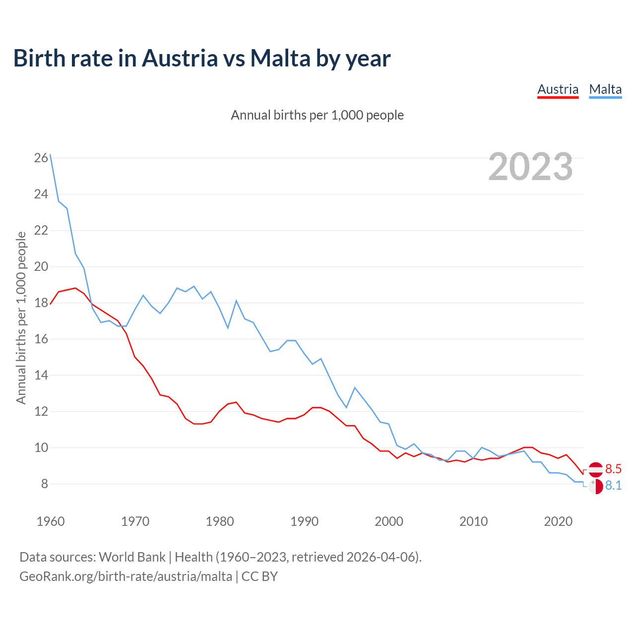 According to the latest available data on birth rates, the fertility rate in Austria was 1.32 children per woman in 2023, compared to 1.06 in Malta in 2023. The replacement level is considered to be 2.1 children per woman.