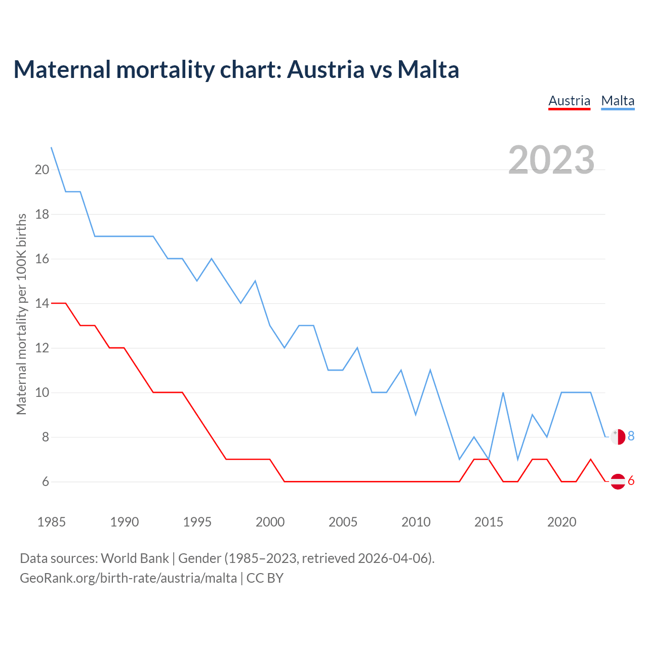 The maternal mortality rate, which is the probability of dying during childbirth or within 42 days of pregnancy termination, is 6 deaths per 100,000 live births in Austria, compared to 8 deaths in Malta.