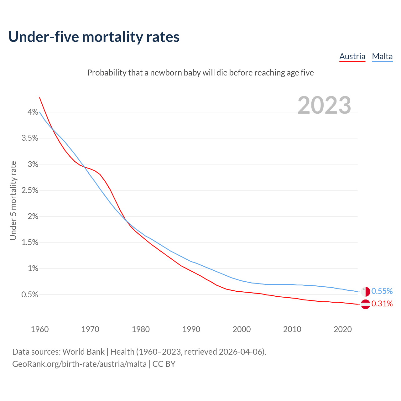 The chance that a newborn baby will die before reaching age five is 0.31% in Austria and 0.55% in Malta. Above is a chart with historical data on under-five mortality rates.