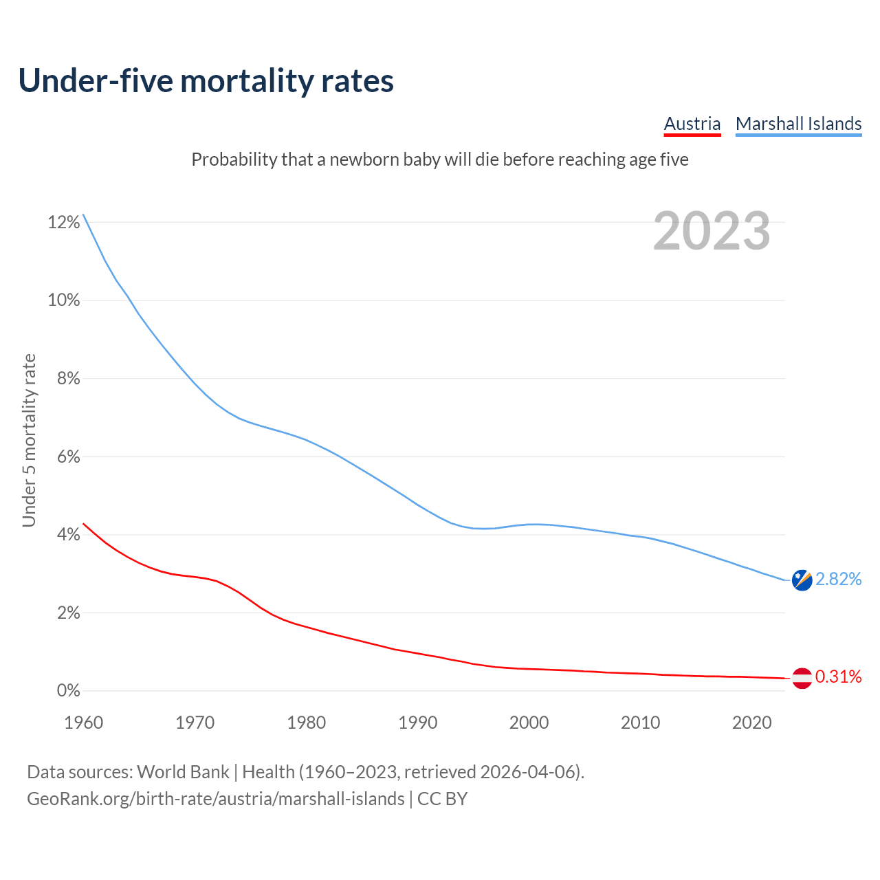 The chance that a newborn baby will die before reaching age five is 0.31% in Austria and 2.82% in the Marshall Islands. Above is a chart with historical data on under-five mortality rates.