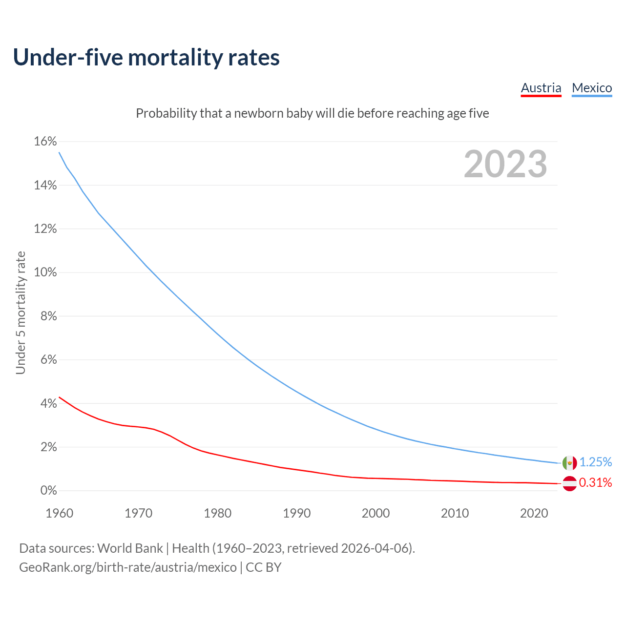 The chance that a newborn baby will die before reaching age five is 0.31% in Austria and 1.25% in Mexico. Above is a chart with historical data on under-five mortality rates.