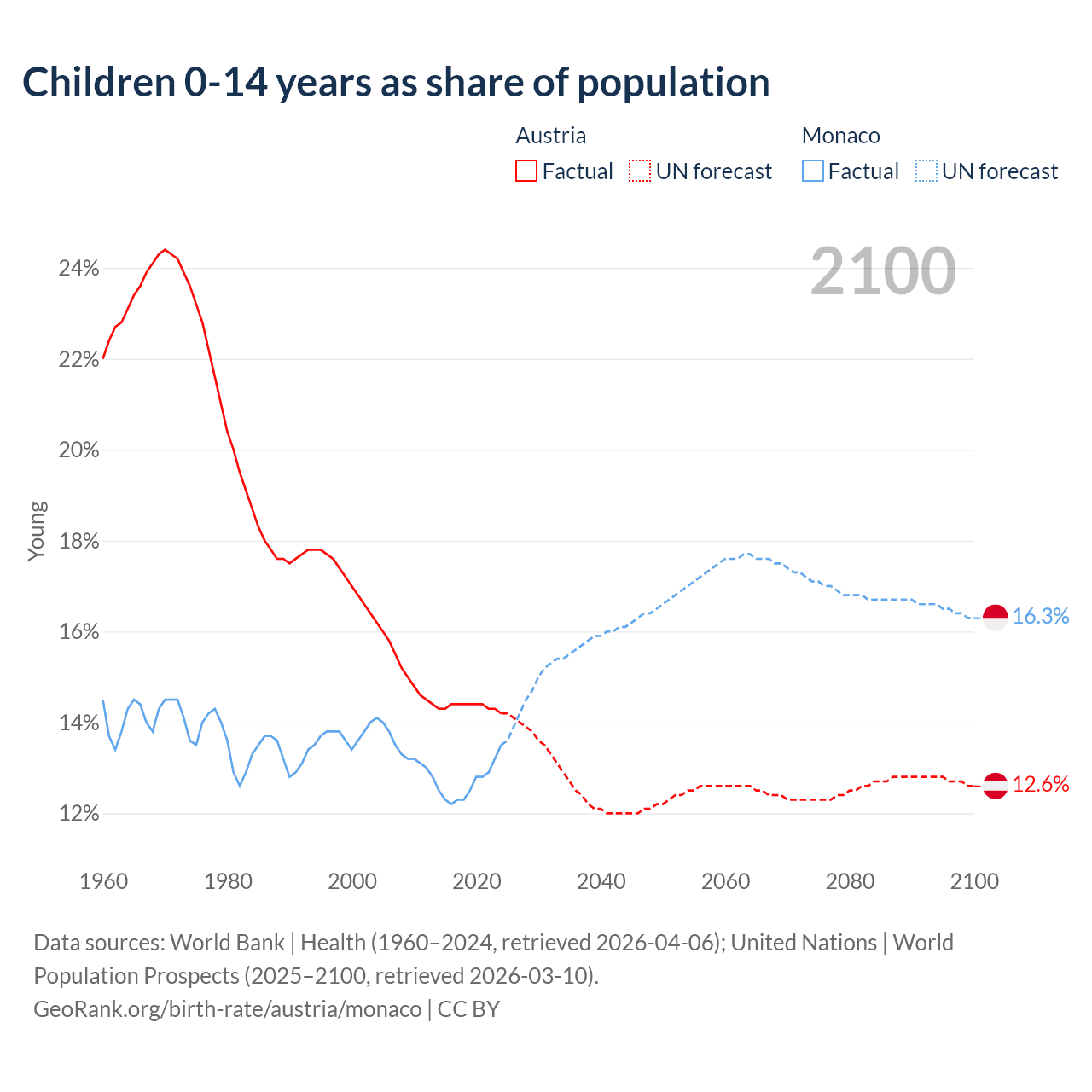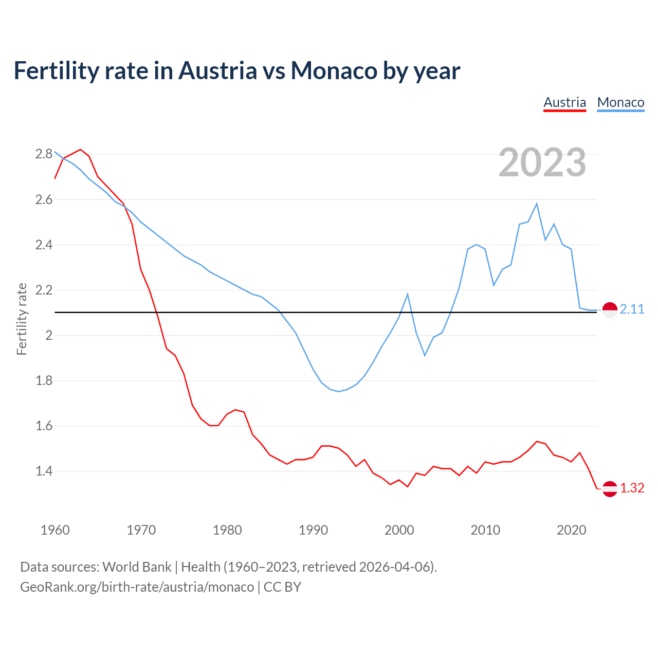 According to the latest available data on birth rates, the fertility rate in Austria was 1.32 children per woman in 2023, compared to 2.11 in Monaco in 2023. The replacement level is considered to be 2.1 children per woman.