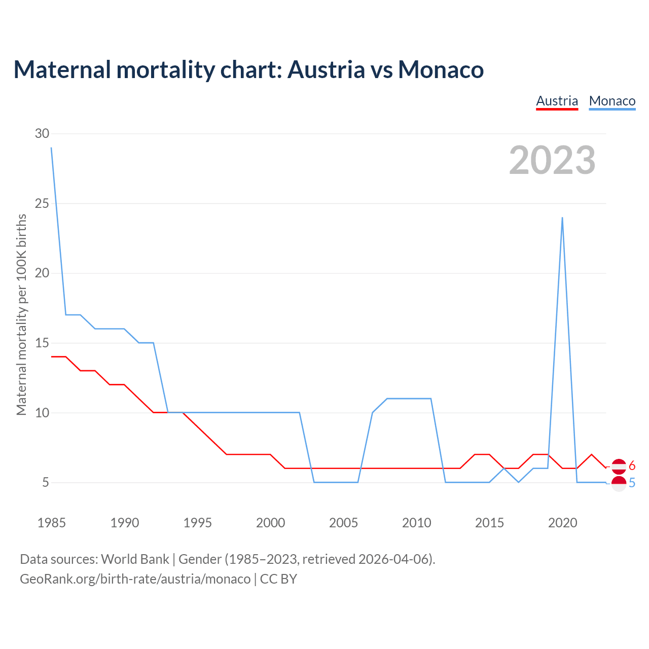 The maternal mortality rate, which is the probability of dying during childbirth or within 42 days of pregnancy termination, is 6 deaths per 100,000 live births in Austria, compared to 5 deaths in Monaco.