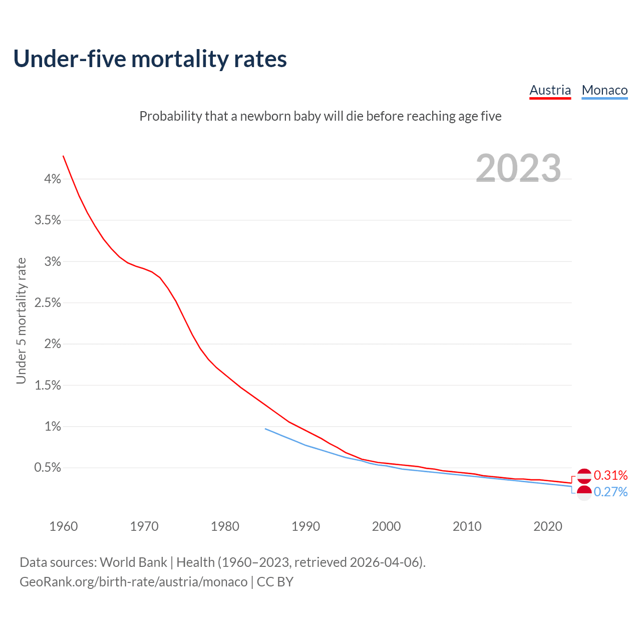 The chance that a newborn baby will die before reaching age five is 0.31% in Austria and 0.27% in Monaco. Above is a chart with historical data on under-five mortality rates.