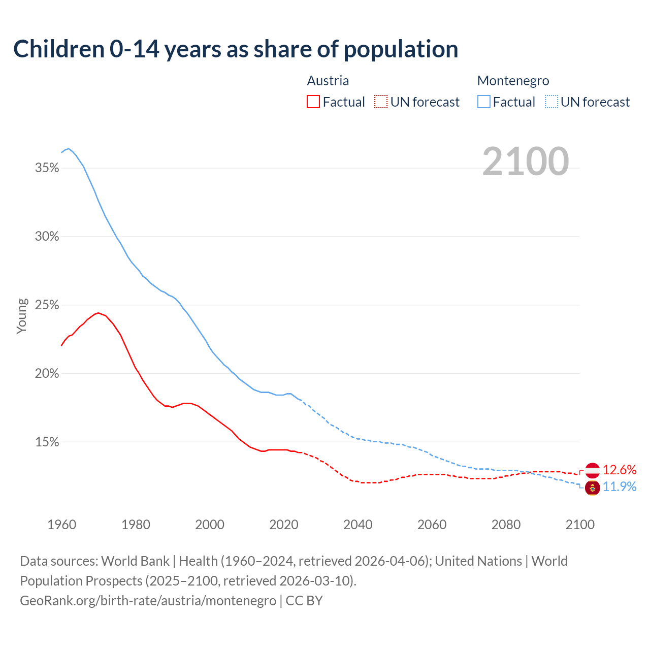 According to the latest available data on birth rates, the fertility rate in Austria was 1.32 children per woman in 2023, compared to 1.74 in Montenegro in 2023. The replacement level is considered to be 2.1 children per woman.