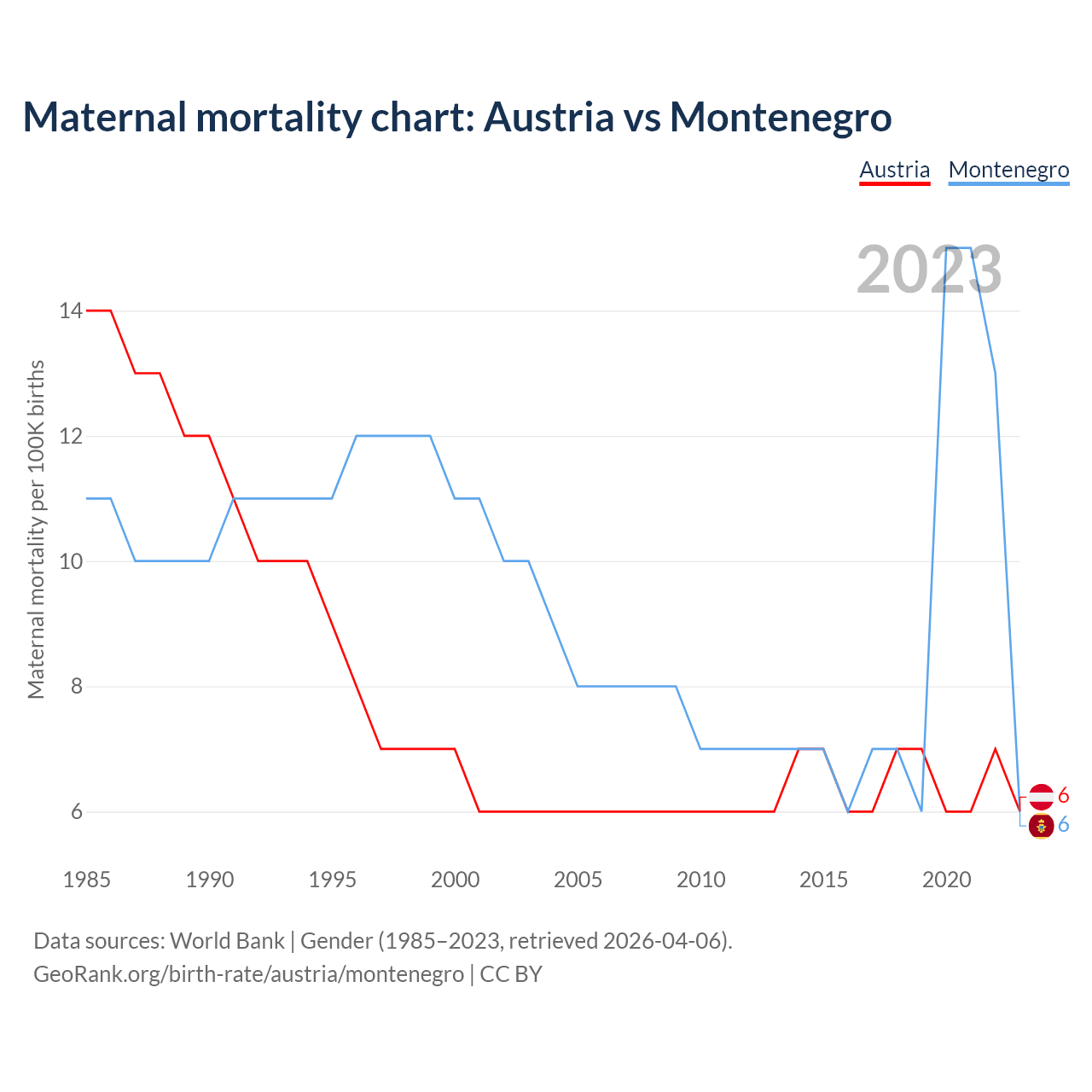 The maternal mortality rate, which is the probability of dying during childbirth or within 42 days of pregnancy termination, is 6 deaths per 100,000 live births in Austria, compared to 6 deaths in Montenegro.