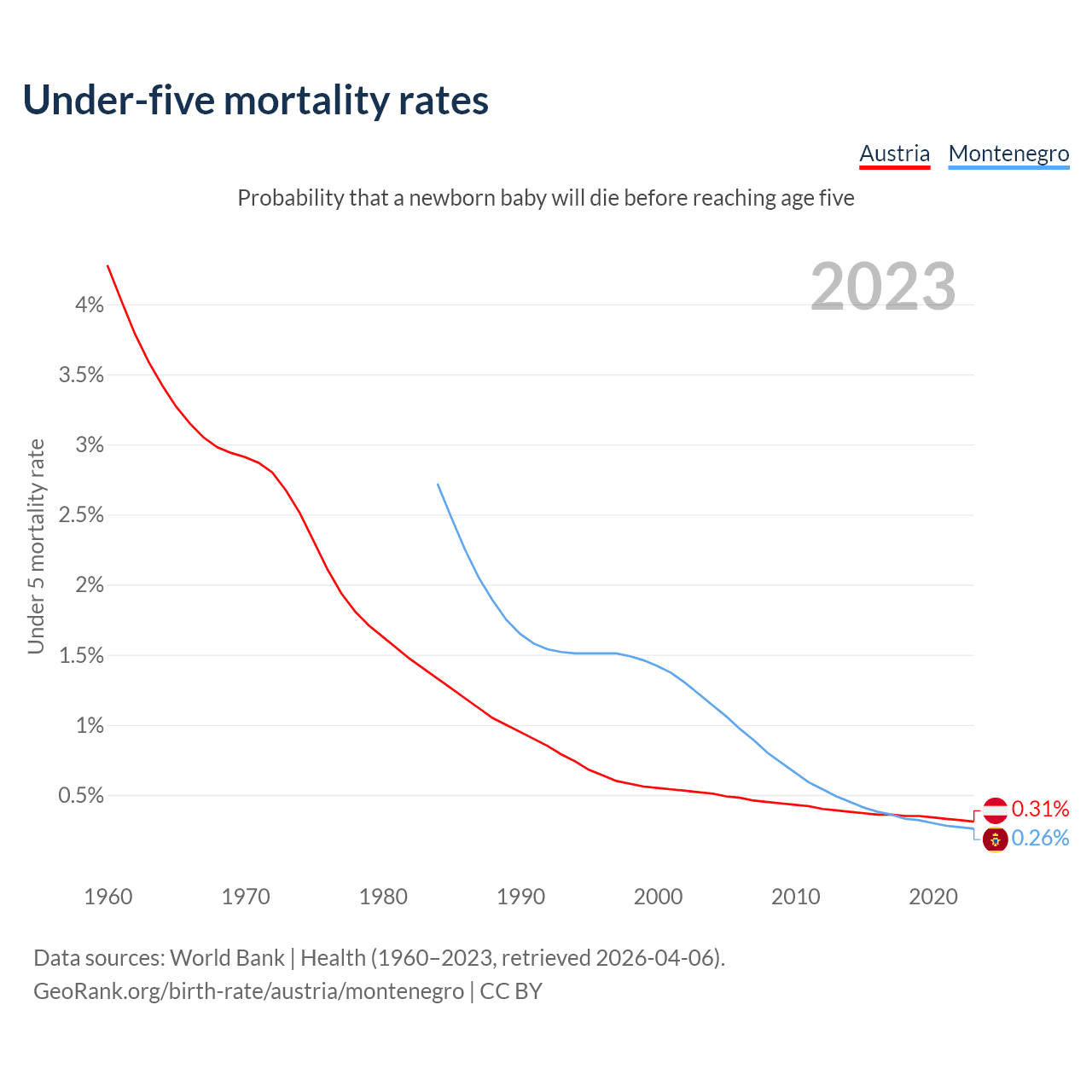The chance that a newborn baby will die before reaching age five is 0.31% in Austria and 0.26% in Montenegro. Above is a chart with historical data on under-five mortality rates.