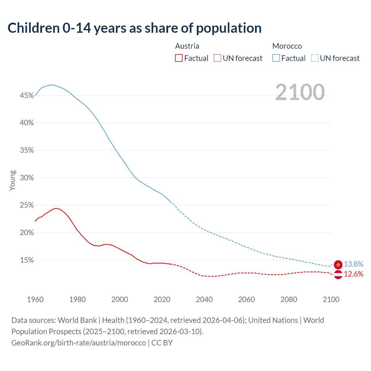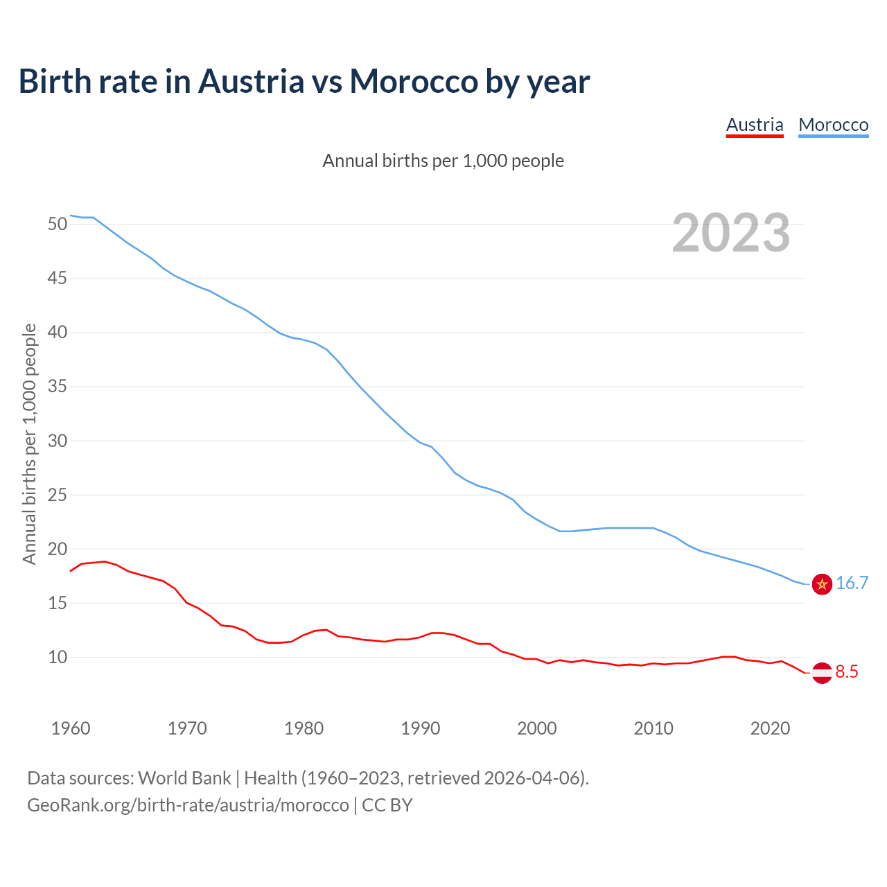 Austria has an annual birth rate of 8.5 births per 1,000 people, compared to 16.7 for Morocco. The average number of children a woman is expected to have during her lifetime — the fertility rate, is 1.32 in Austria and 2.23 in Morocco — 68.9% difference.