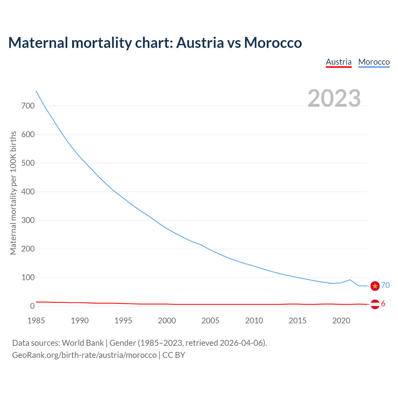 The maternal mortality rate, which is the probability of dying during childbirth or within 42 days of pregnancy termination, is 6 deaths per 100,000 live births in Austria, compared to 70 deaths in Morocco.