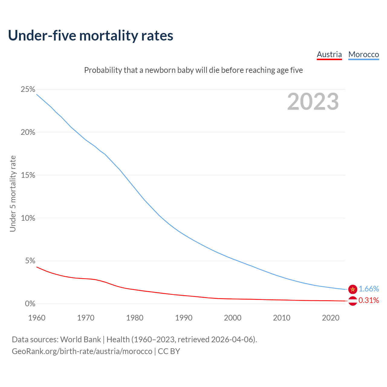 The chance that a newborn baby will die before reaching age five is 0.31% in Austria and 1.66% in Morocco. Above is a chart with historical data on under-five mortality rates.