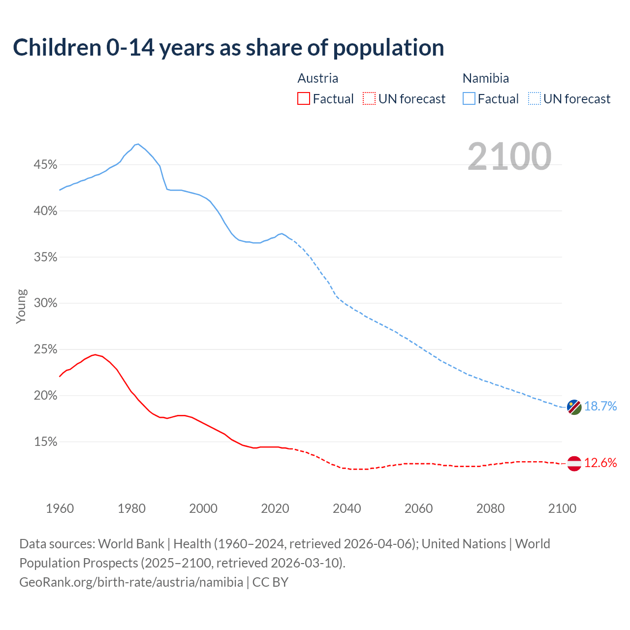 According to the latest available data on birth rates, the fertility rate in Austria was 1.32 children per woman in 2023, compared to 3.21 in Namibia in 2023. The replacement level is considered to be 2.1 children per woman.
