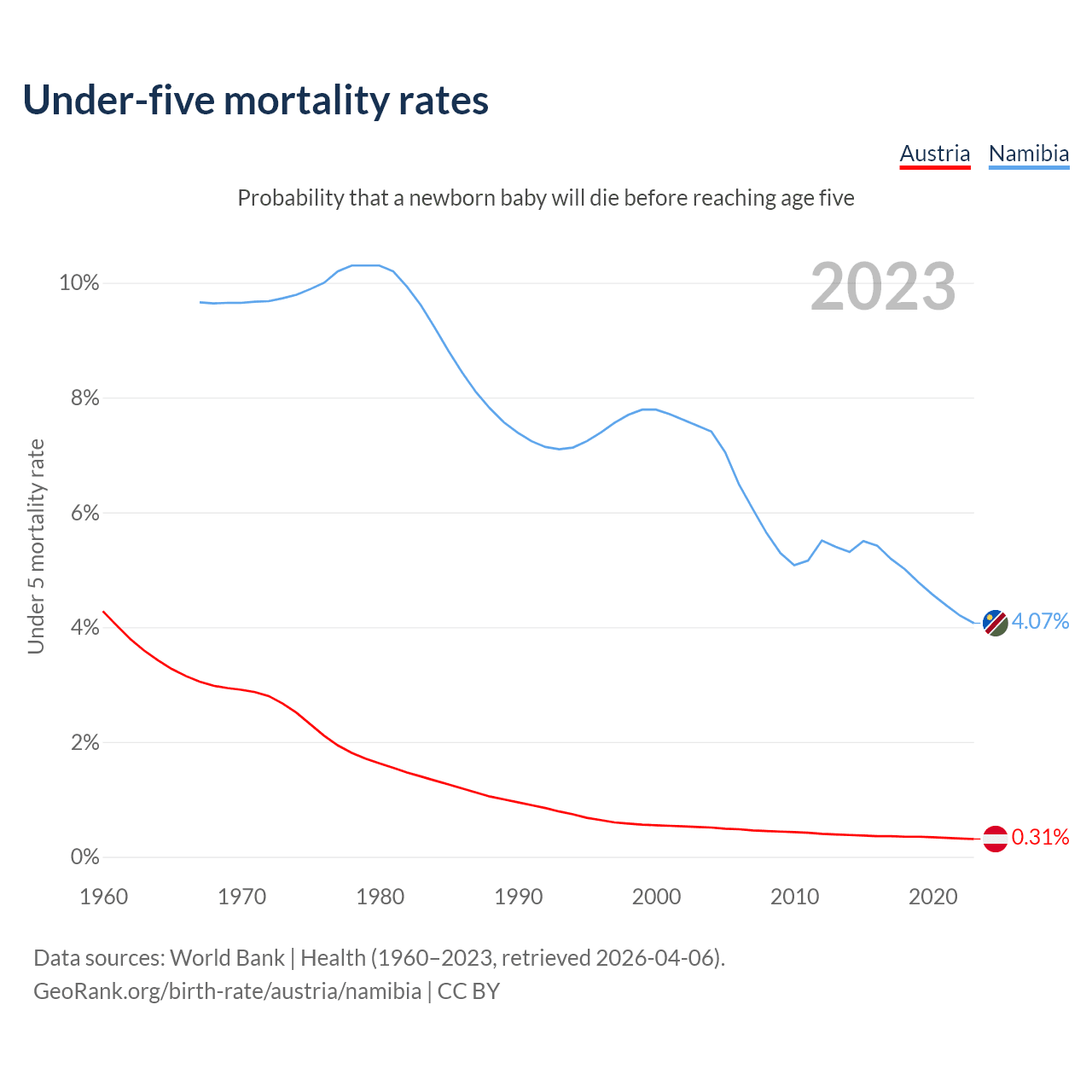 The chance that a newborn baby will die before reaching age five is 0.31% in Austria and 4.07% in Namibia. Above is a chart with historical data on under-five mortality rates.