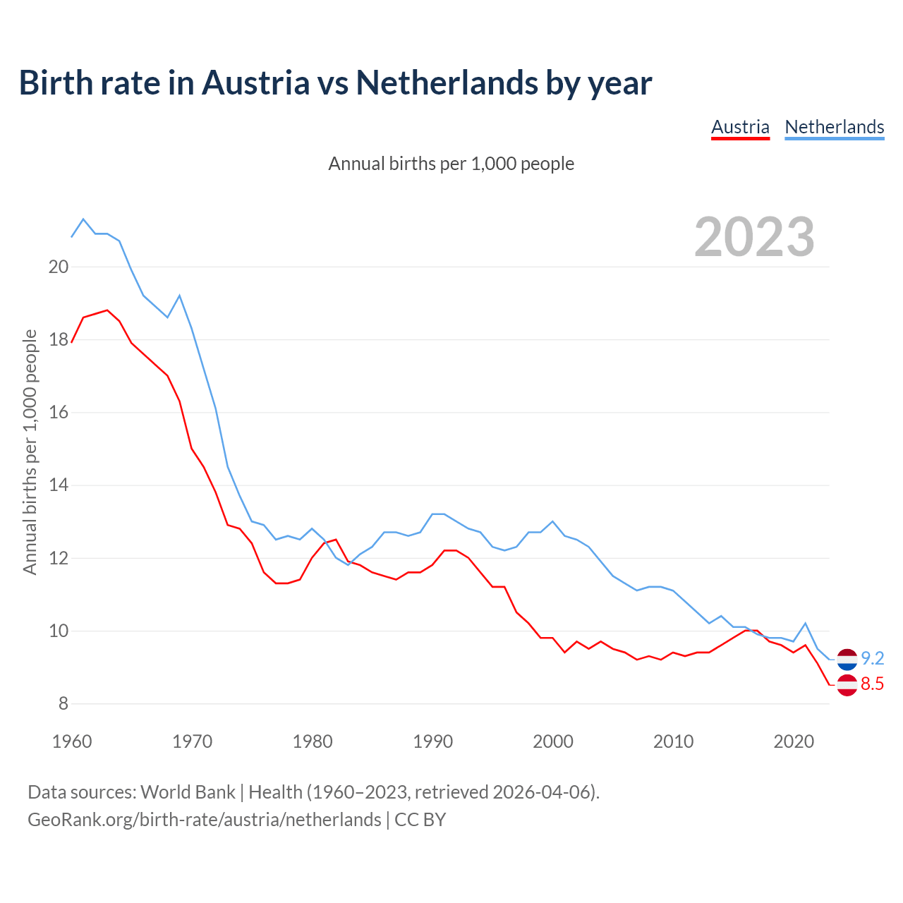 Austria has an annual birth rate of 8.5 births per 1,000 people, compared to 9.2 for the Netherlands. The average number of children a woman is expected to have during her lifetime — the fertility rate, is 1.32 in Austria and 1.43 in the Netherlands — 8.33% difference.