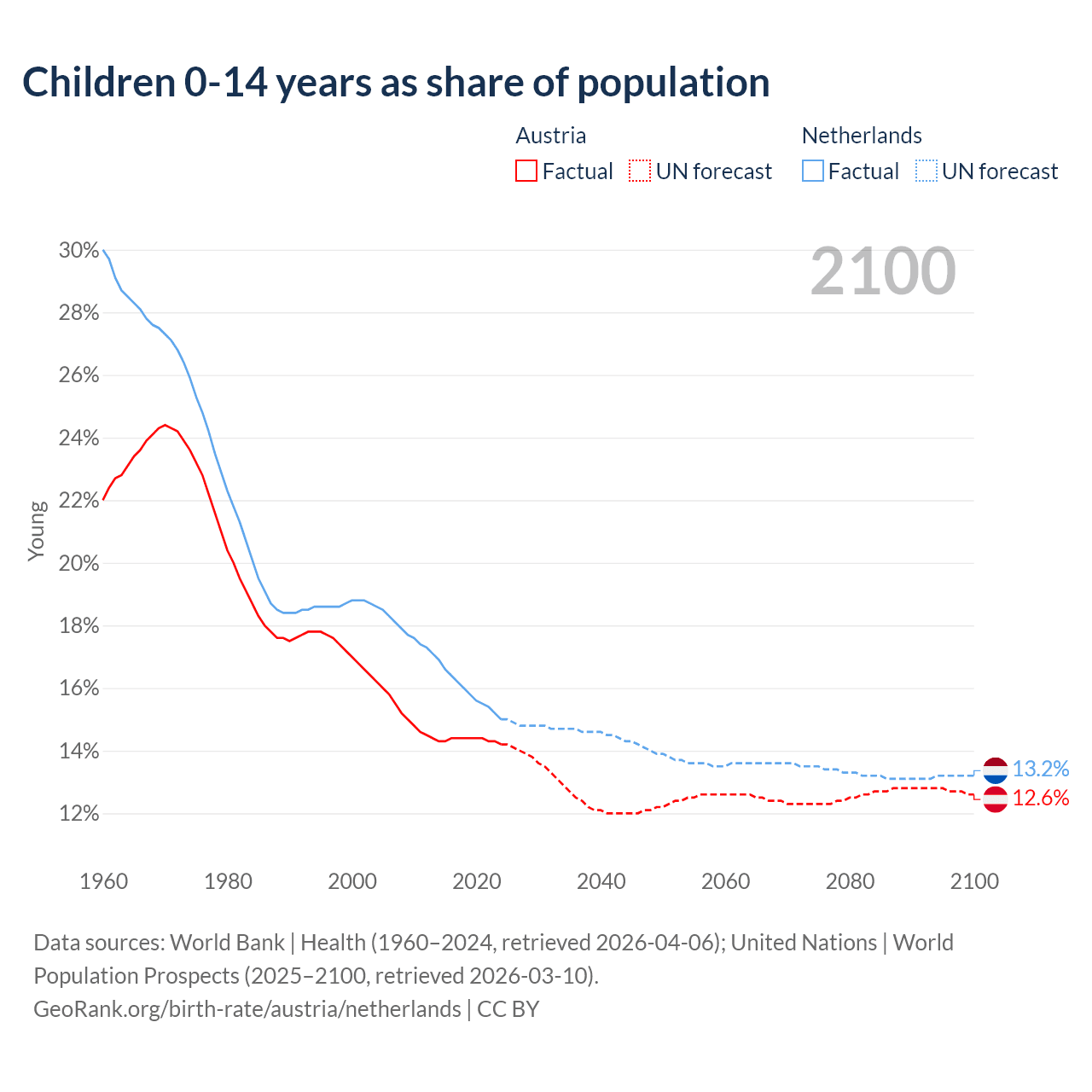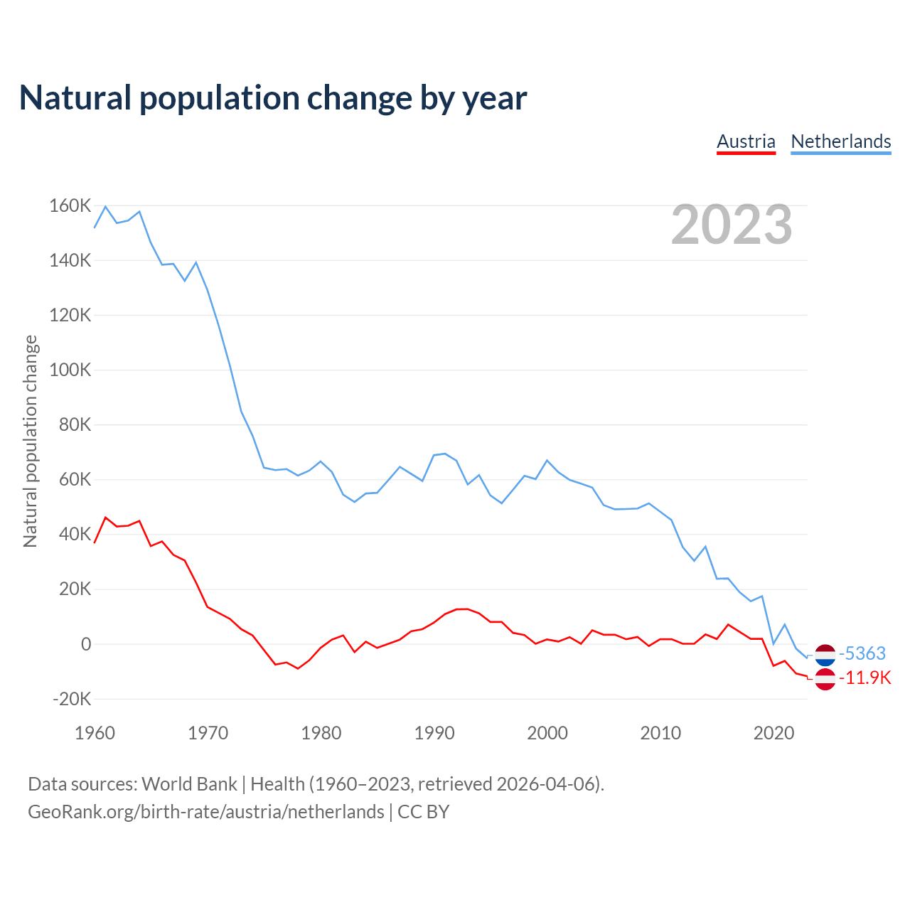 According to the latest available data on birth rates, the fertility rate in Austria was 1.32 children per woman in 2023, compared to 1.43 in the Netherlands in 2023. The replacement level is considered to be 2.1 children per woman.