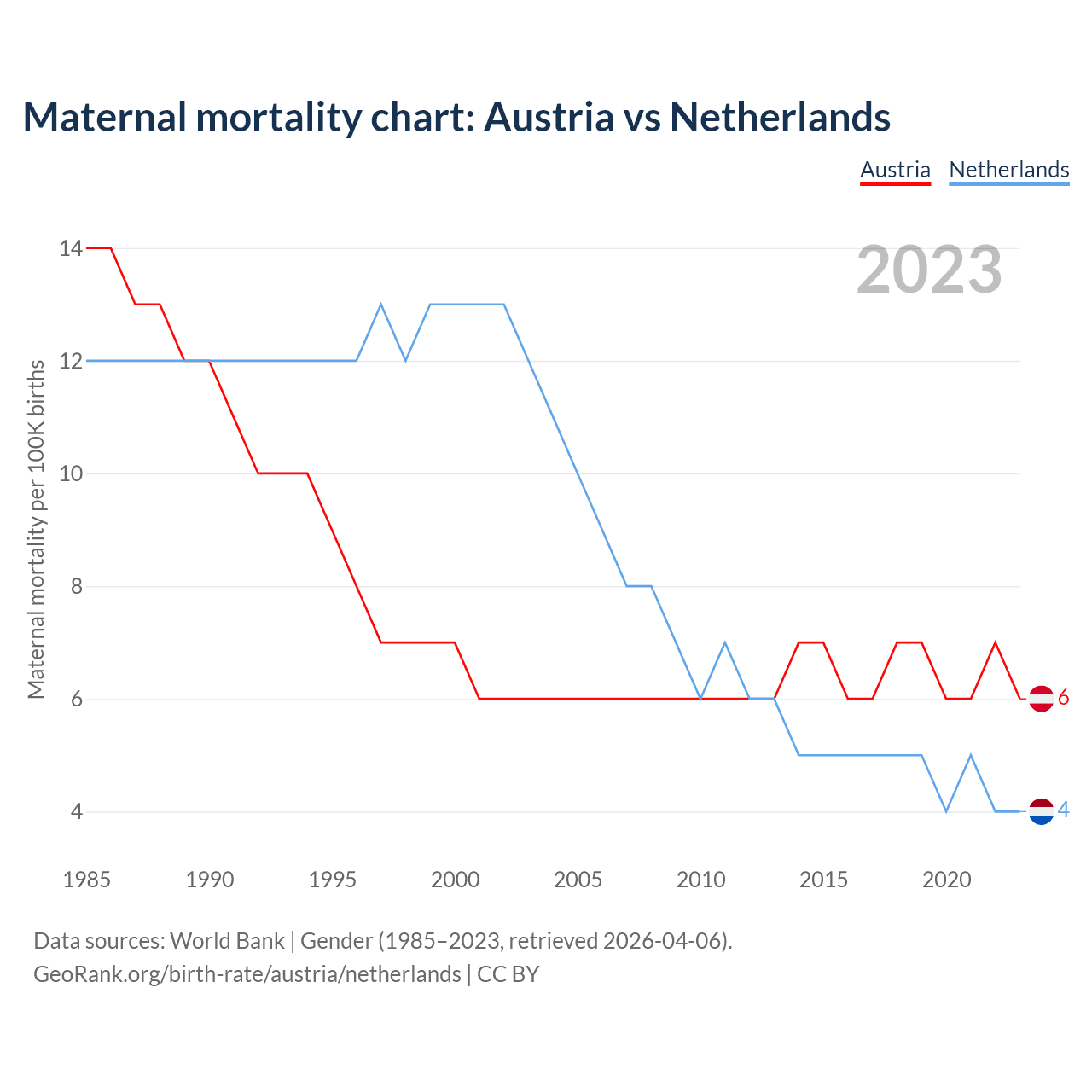 The maternal mortality rate, which is the probability of dying during childbirth or within 42 days of pregnancy termination, is 6 deaths per 100,000 live births in Austria, compared to 4 deaths in the Netherlands.