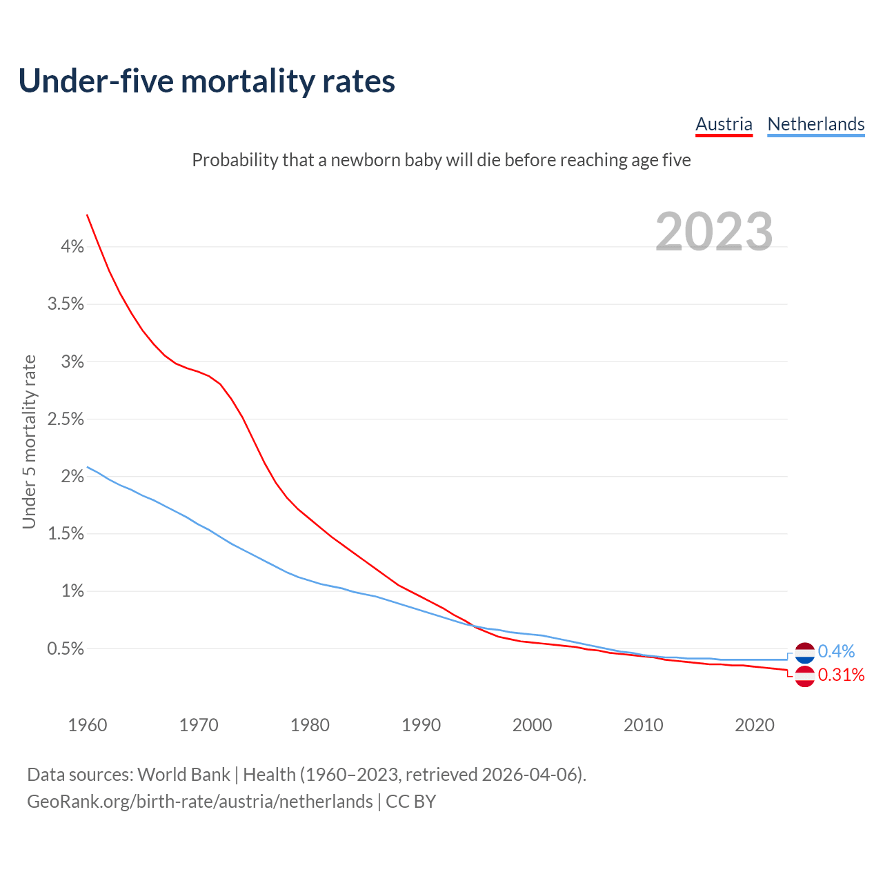 The chance that a newborn baby will die before reaching age five is 0.31% in Austria and 0.4% in the Netherlands. Above is a chart with historical data on under-five mortality rates.
