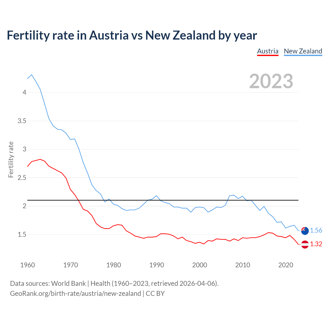1960 vs 2023, the fertility rate has decreased by 50.9% in Austria and by 63.2% in New Zealand — in 1960, it was 2.69 and 4.24, respectively.