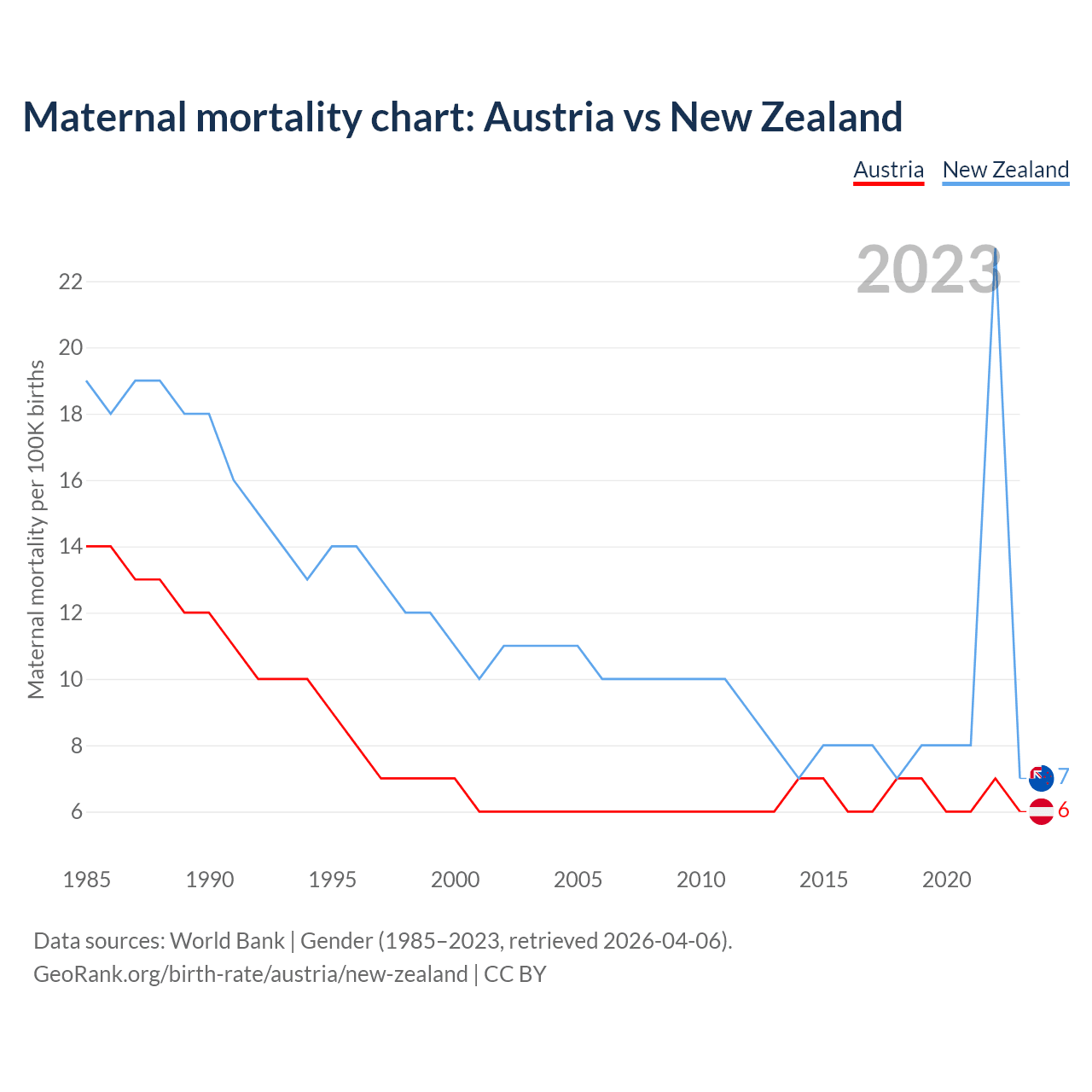 The maternal mortality rate, which is the probability of dying during childbirth or within 42 days of pregnancy termination, is 6 deaths per 100,000 live births in Austria, compared to 7 deaths in New Zealand.