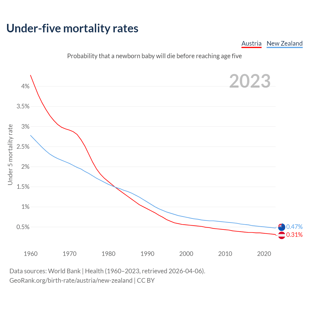 The chance that a newborn baby will die before reaching age five is 0.31% in Austria and 0.47% in New Zealand. Above is a chart with historical data on under-five mortality rates.