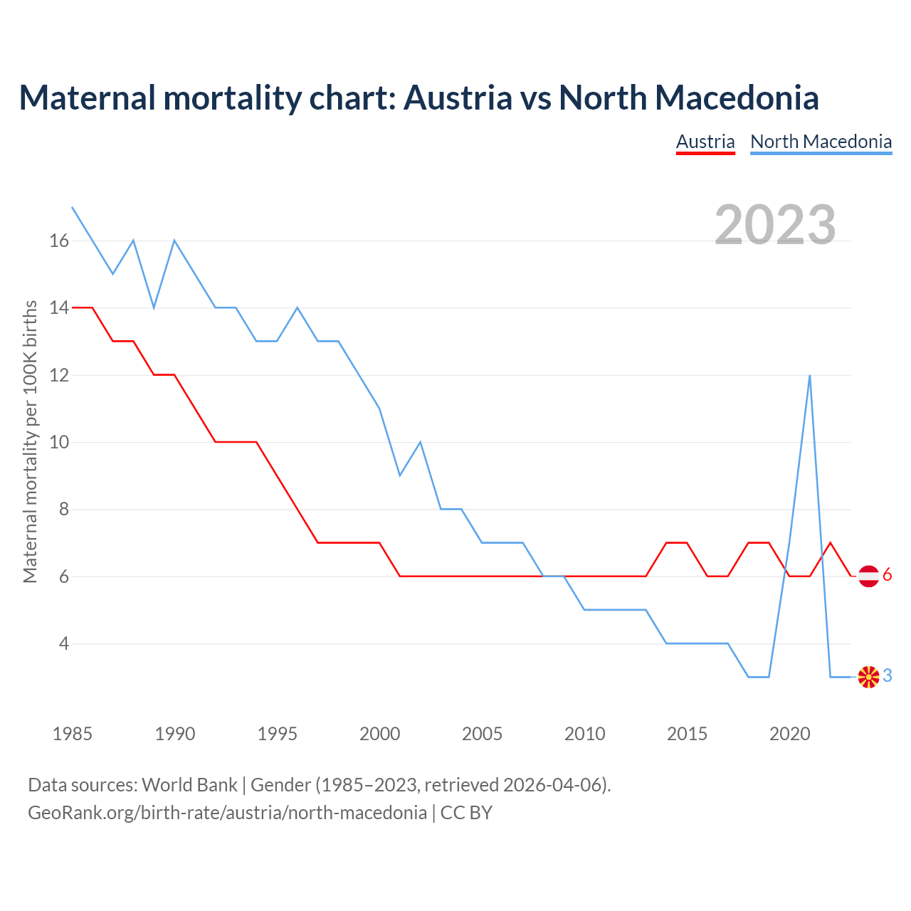 The maternal mortality rate, which is the probability of dying during childbirth or within 42 days of pregnancy termination, is 6 deaths per 100,000 live births in Austria, compared to 3 deaths in North Macedonia.
