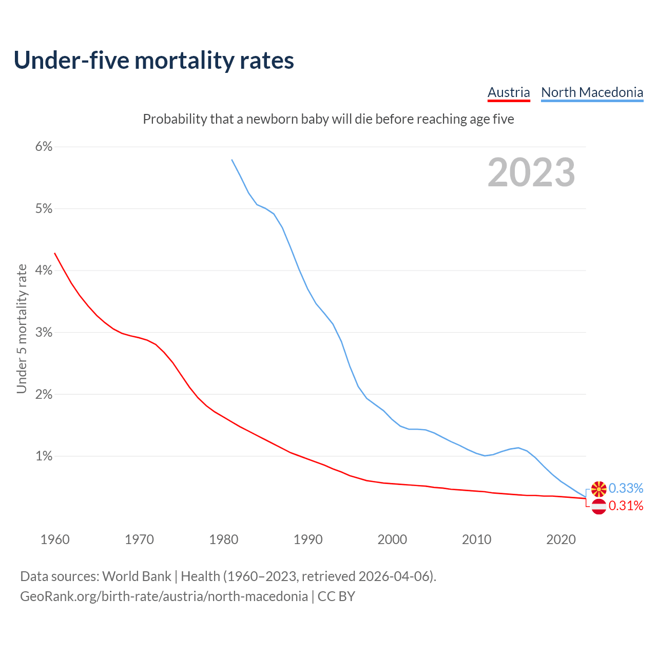 The chance that a newborn baby will die before reaching age five is 0.31% in Austria and 0.33% in North Macedonia. Above is a chart with historical data on under-five mortality rates.
