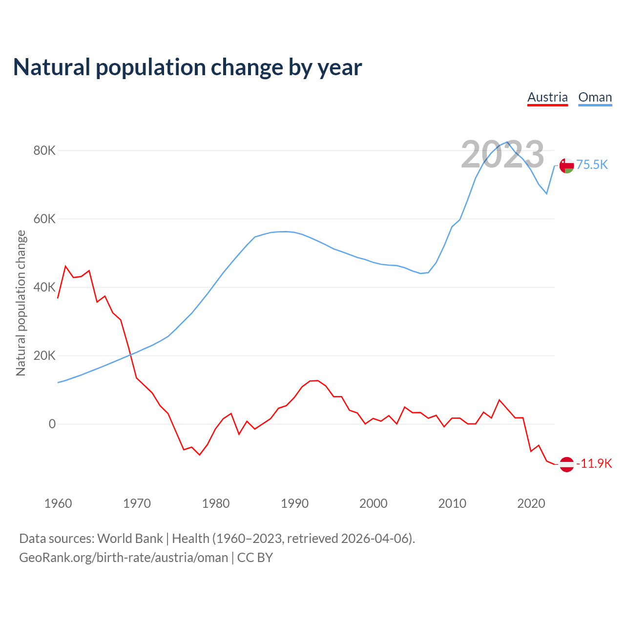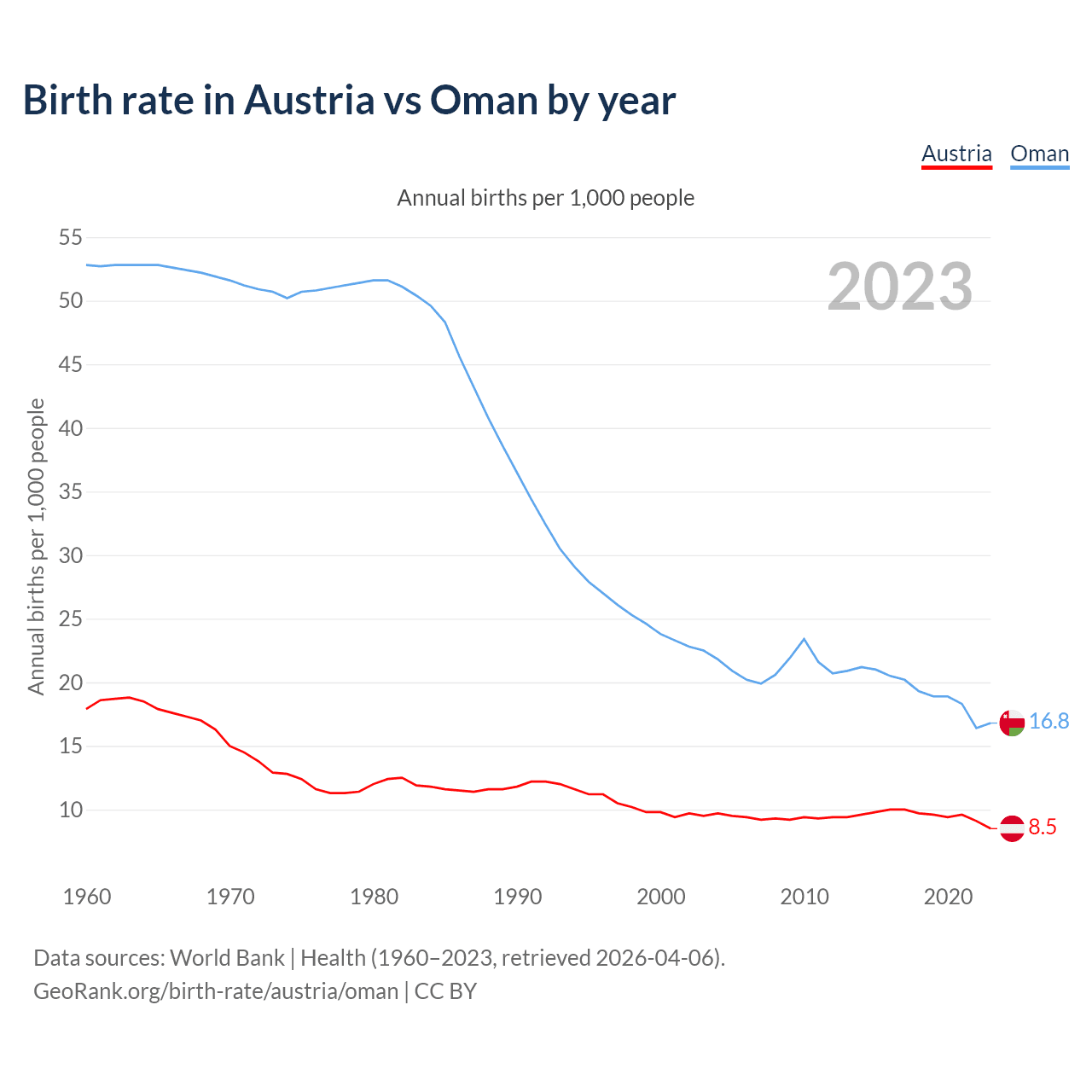 Austria has an annual birth rate of 8.5 births per 1,000 people, compared to 16.8 for Oman. The average number of children a woman is expected to have during her lifetime — the fertility rate, is 1.32 in Austria and 2.53 in Oman — 91.3% difference.