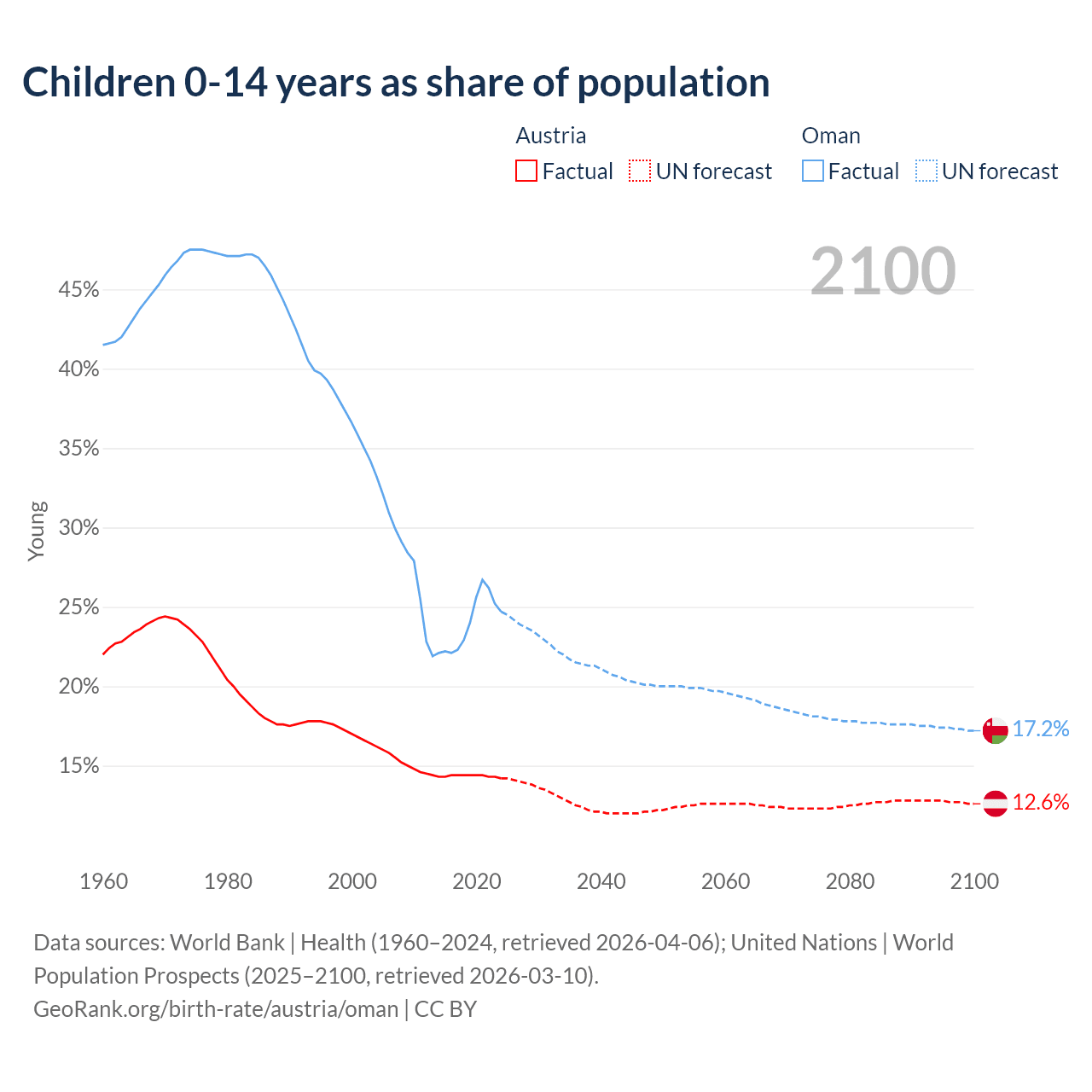 According to the latest available data on birth rates, the fertility rate in Austria was 1.32 children per woman in 2023, compared to 2.53 in Oman in 2023. The replacement level is considered to be 2.1 children per woman.