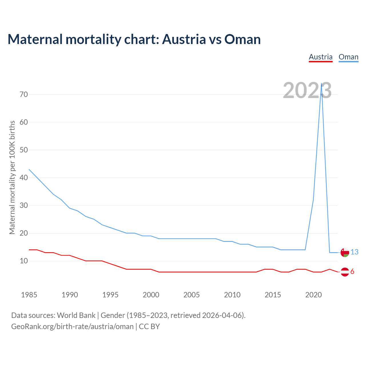The maternal mortality rate, which is the probability of dying during childbirth or within 42 days of pregnancy termination, is 6 deaths per 100,000 live births in Austria, compared to 13 deaths in Oman.