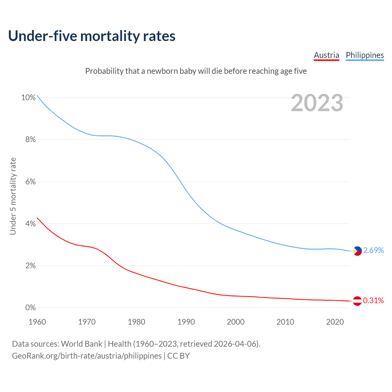 The chance that a newborn baby will die before reaching age five is 0.31% in Austria and 2.69% in the Philippines. Above is a chart with historical data on under-five mortality rates.