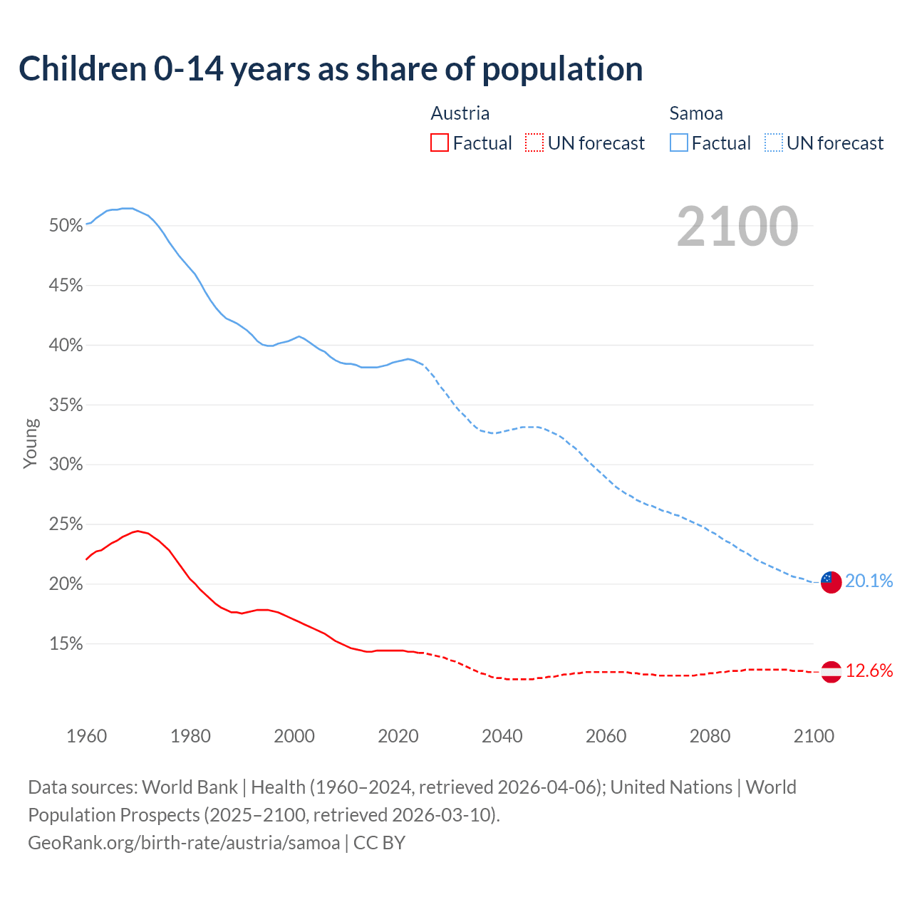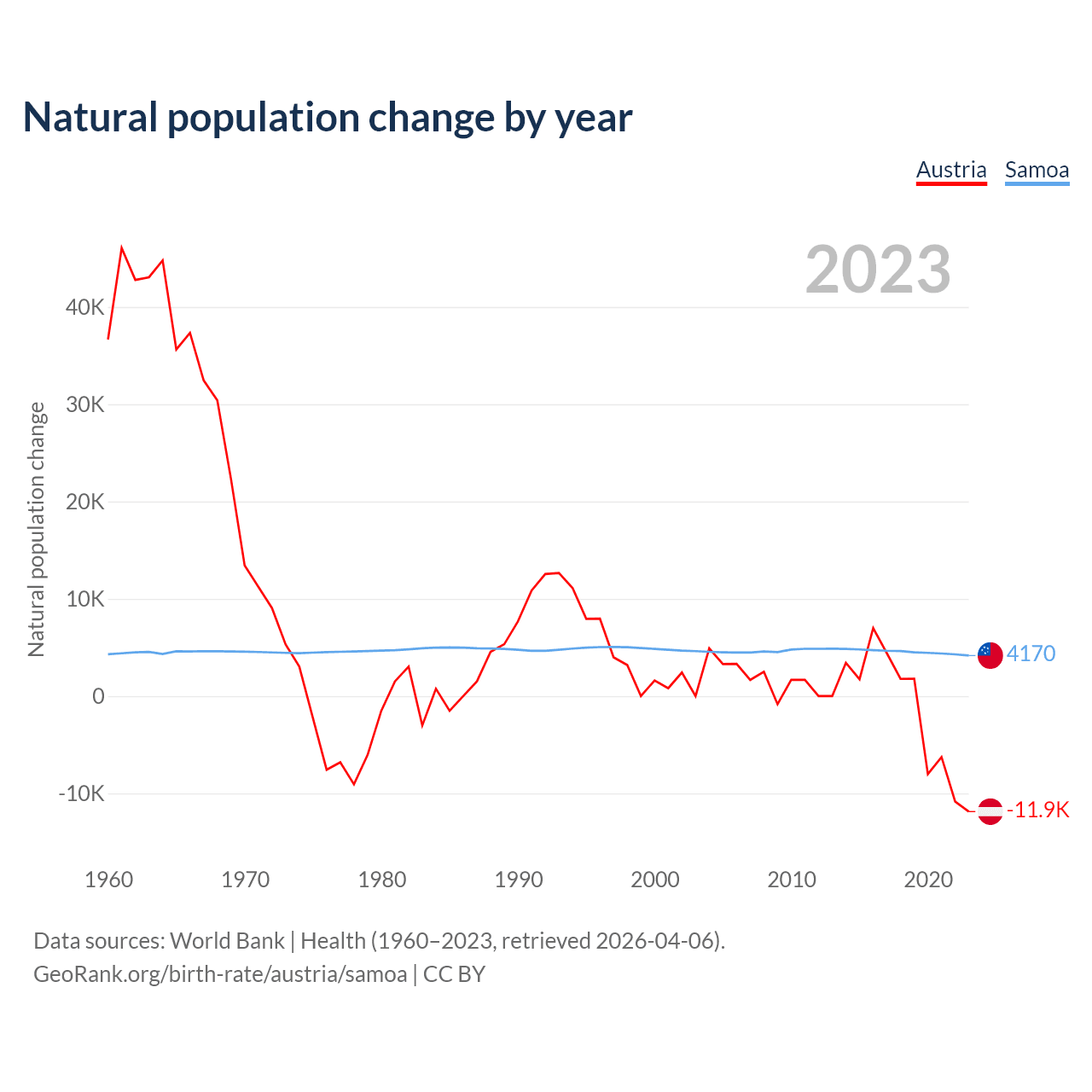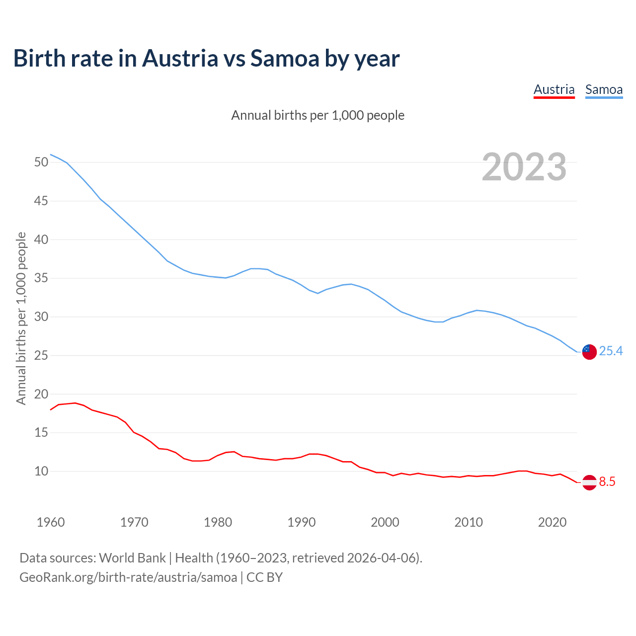 Austria has an annual birth rate of 8.5 births per 1,000 people, compared to 25.4 for Samoa. The average number of children a woman is expected to have during her lifetime — the fertility rate, is 1.32 in Austria and 3.83 in Samoa — 190.1% difference.